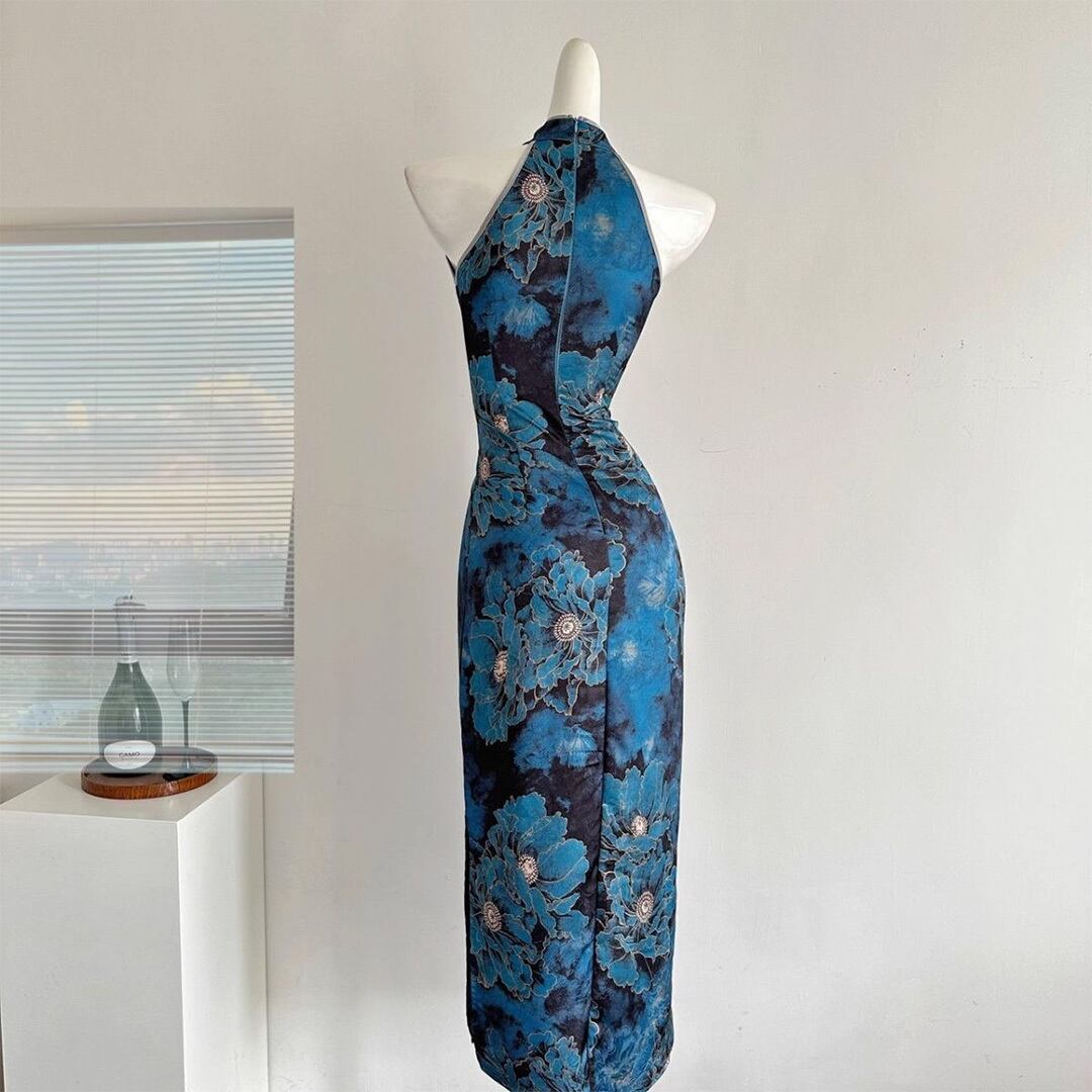 花柄 ホルターネック風ロングチャイナドレス アオザイ チャイナドレス チャイナ服 ビーズボタン ロング サイドスリット 濃紺 ネイビー ミッドナイトブルー ディープブルー レディース レトロ柄 シック 大人っぽい 高見え 牡丹柄 大人可愛い きれいめ シンプル 大人 上品 おしゃれ レトロ スリット 深スリット 盘扣 パンコウ チャイナボタン スタンドカラー ノースリーブ 大人女子 クール エレガント レディース 会合 パーティ 食事会 デート お出かけ 女子会