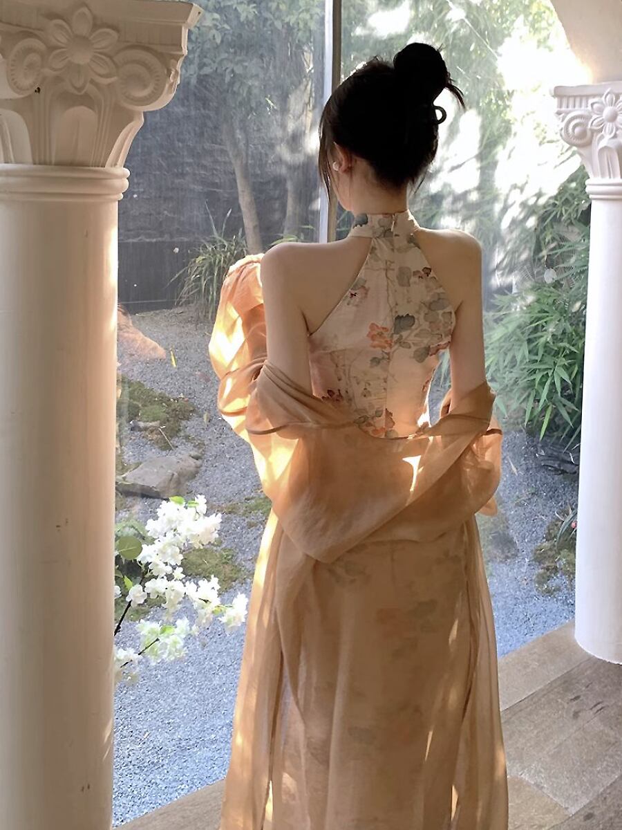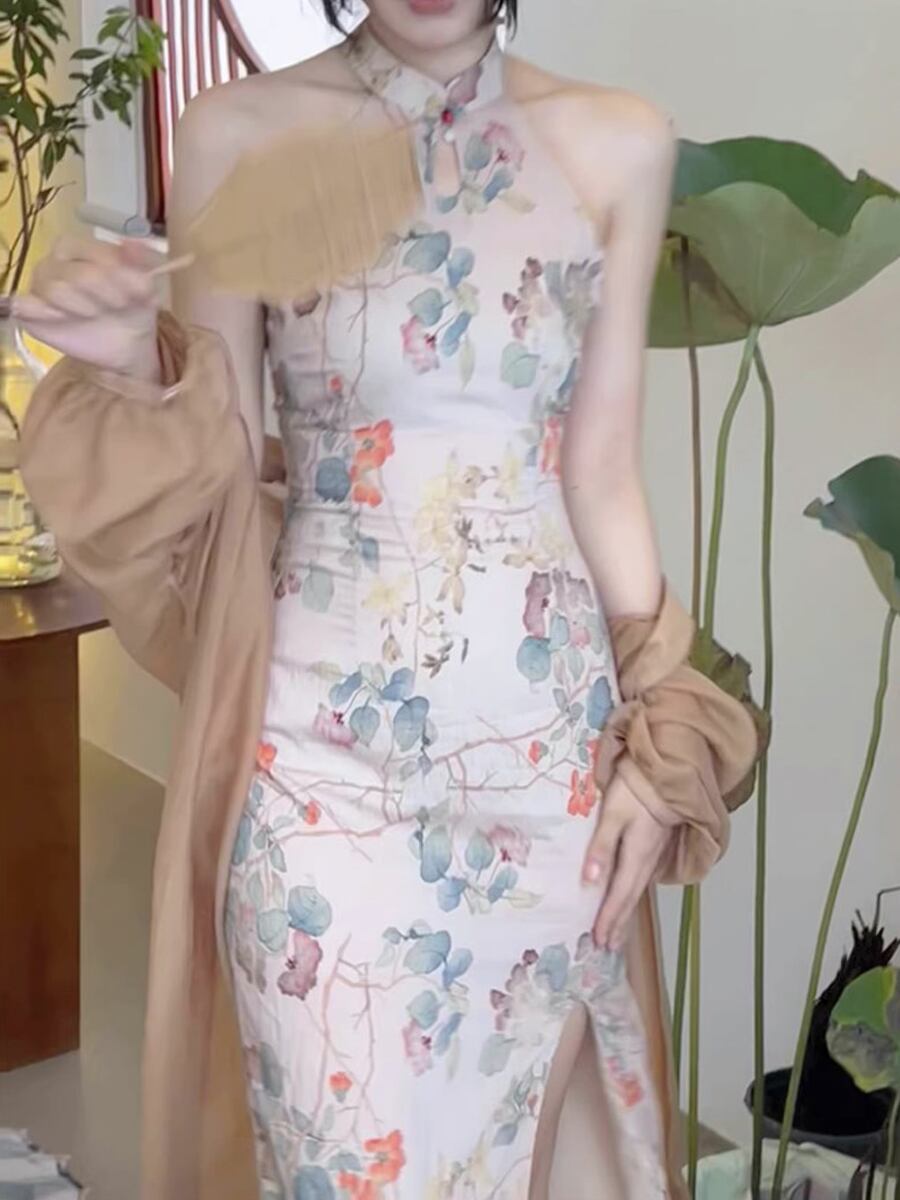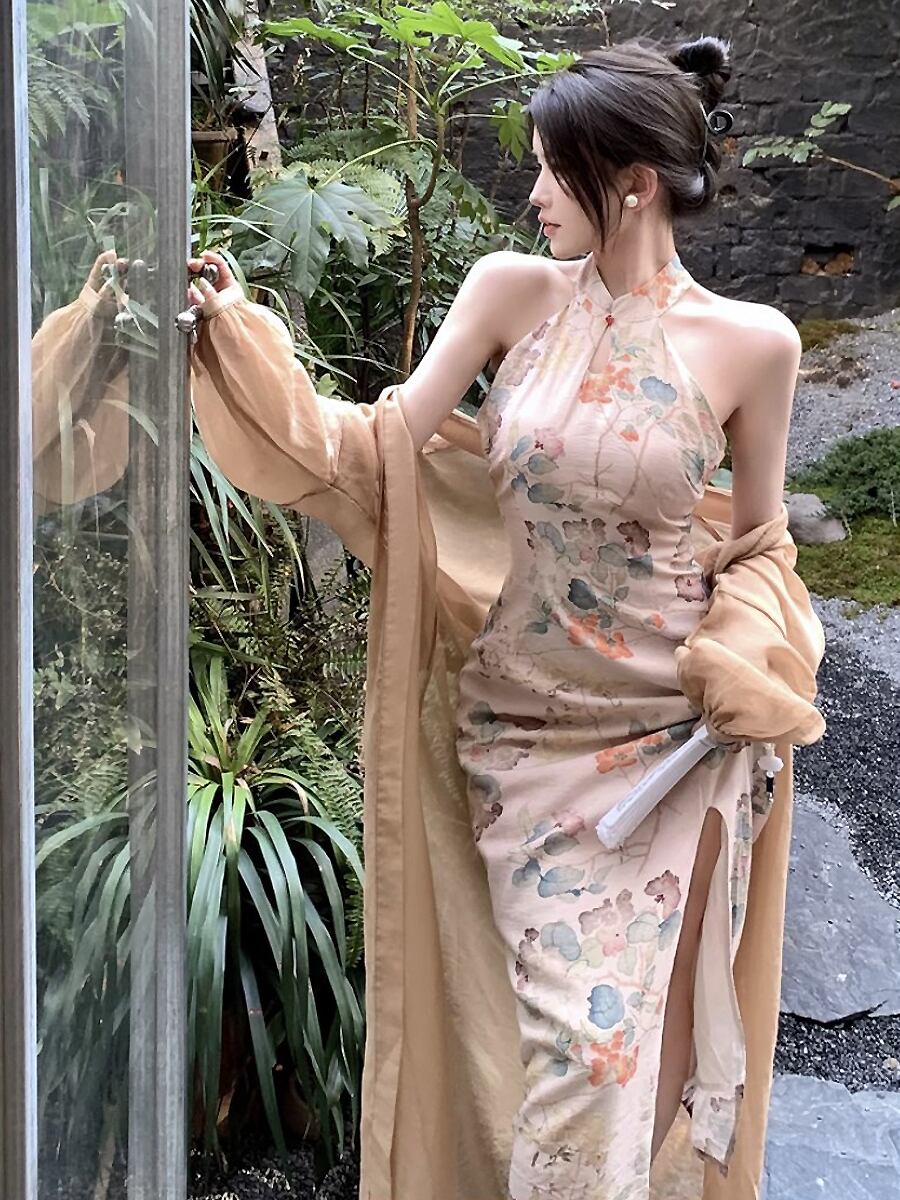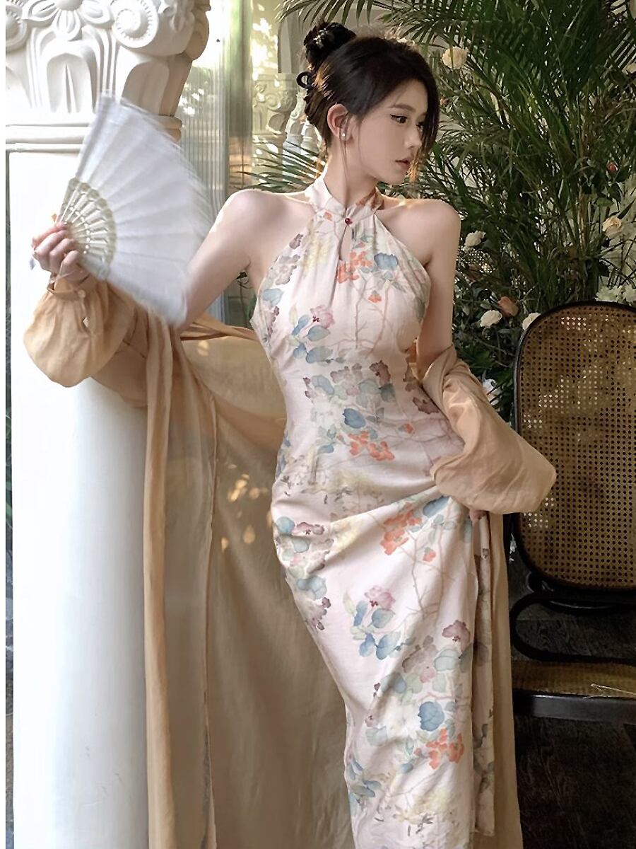 2点セット キーホールネックチャイナワンピースドレス+シースルーロングカーディガン ホルターネック チャイナドレス アオザイ チャイナドレス チャイナ服 パンコウ 水墨画風 花柄 チャイナボタン ミモレ丈 ミモレ レディース レトロ柄 シック 大人っぽい セクシー 大人可愛い きれいめ シンプル 大人 上品 おしゃれ レトロ スリット ロングカーディガン 透け感 ノースリーブ 大人女子 クール エレガント レディース 会合 パーティ 食事会 デート 結婚式 アプリコット