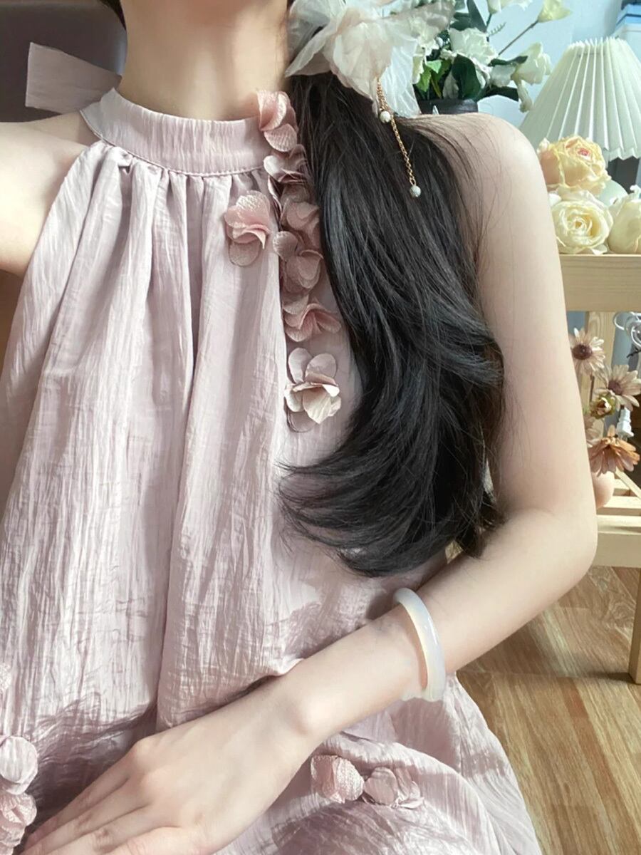 くすみピンク立体花飾り付きシワ加工ロングワンピース ロング ワンピドレス ドレス 肩出し くすみピンク シワ加工 ワッシャー加工 ホルターネック アメリカンスリーブ ノースリーブ Aライン テントライン ふんわり やわらか かわいい 大人可愛い きれいめ シンプル カジュアル 上品 おしゃれ お洒落 かっこいい レトロ 大人女子 こなれ感 ラブリー キュート ガーリー 個性的 モード系 モダン 存在感 レディース 通学 ファッション 韓国コーデ 韓国ファッション ピンク