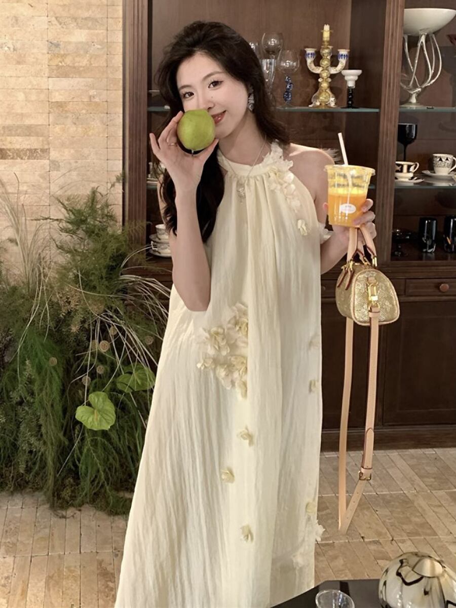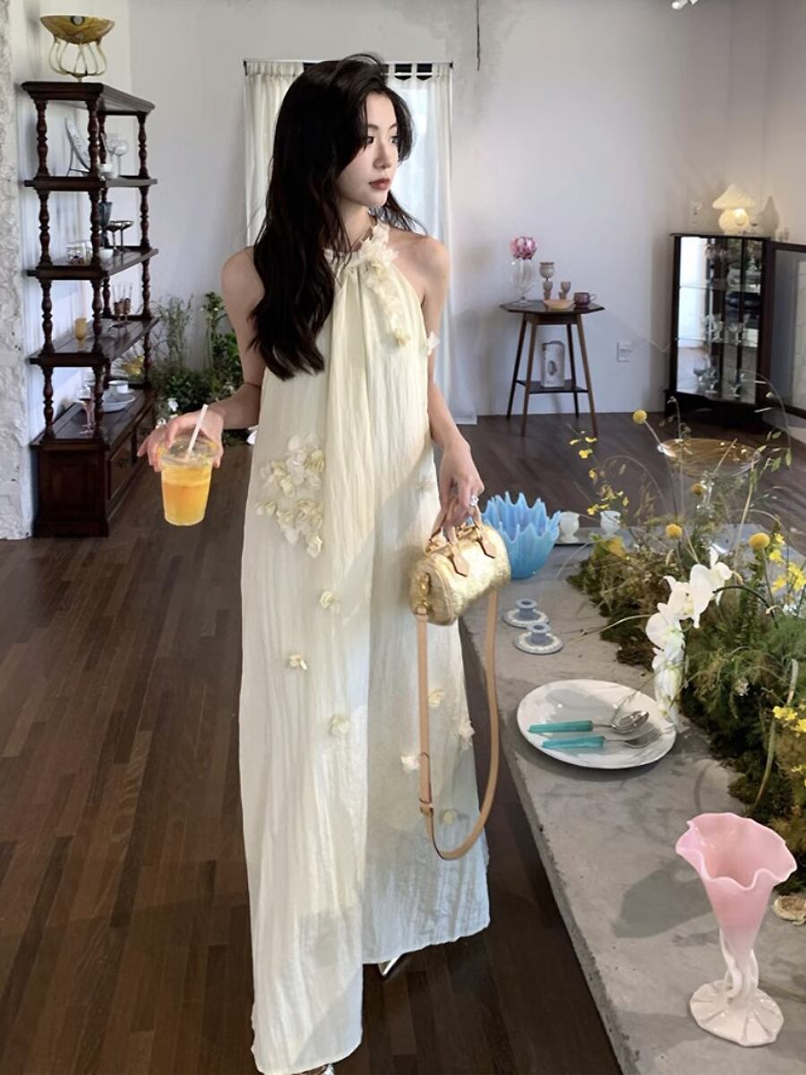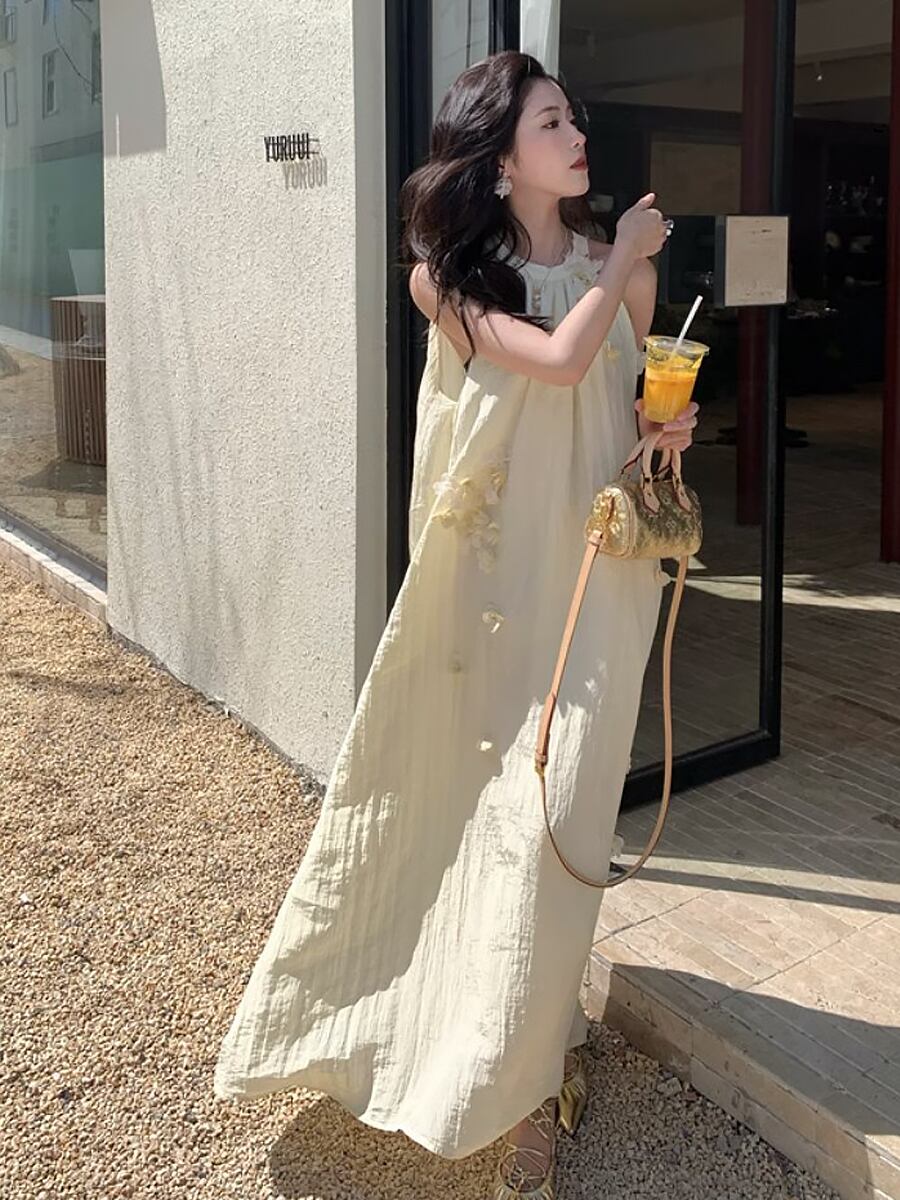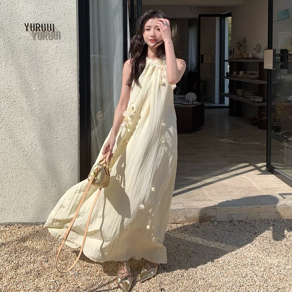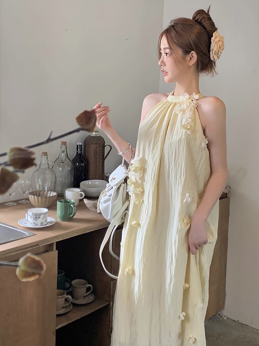 クリームイエロー立体花飾り付きシワ加工ロングワンピース ロング ワンピドレス ドレス 肩出し くすみピンク シワ加工 ワッシャー加工 ホルターネック アメリカンスリーブ ノースリーブ Aライン テントライン ふんわり やわらか かわいい 大人可愛い きれいめ シンプル カジュアル 上品 おしゃれ お洒落 かっこいい レトロ 大人女子 こなれ感 ラブリー キュート ガーリー 個性的 モード系 モダン 存在感 レディース 通学 ファッション 韓国コーデ 韓国ファッション 黄色 イエロー