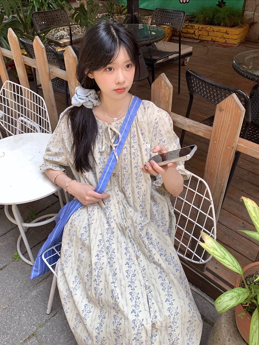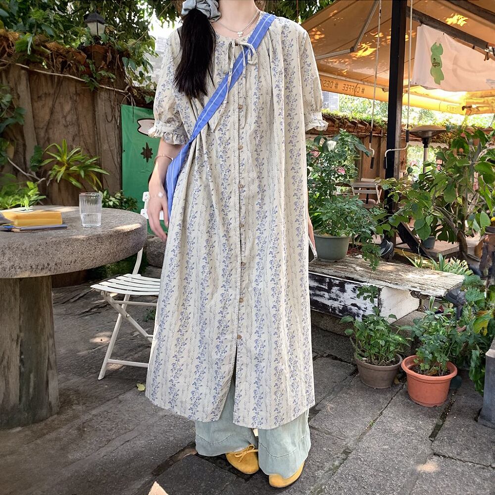綿麻ノーカラー小花柄半袖シャツワンピース シャツワンピース シャツワンピ リボン 花柄 前ボタン ゆったり ミモレ丈 萌袖 ロング ラウンドネック 襟なし ハイウエスト ゆとりあり 楽ちん 締めつけ感なし かわいい 大人可愛い きれいめ シンプル 上品 おしゃれ お洒落 かっこいい レトロ 大人女子 こなれ感 ラブリー ガーリー 個性的 モード系 エレガント 韓国コーデ 韓国ファッション ブルー アプリコット 綿 麻 綿麻混 コットン リネン ギャザー