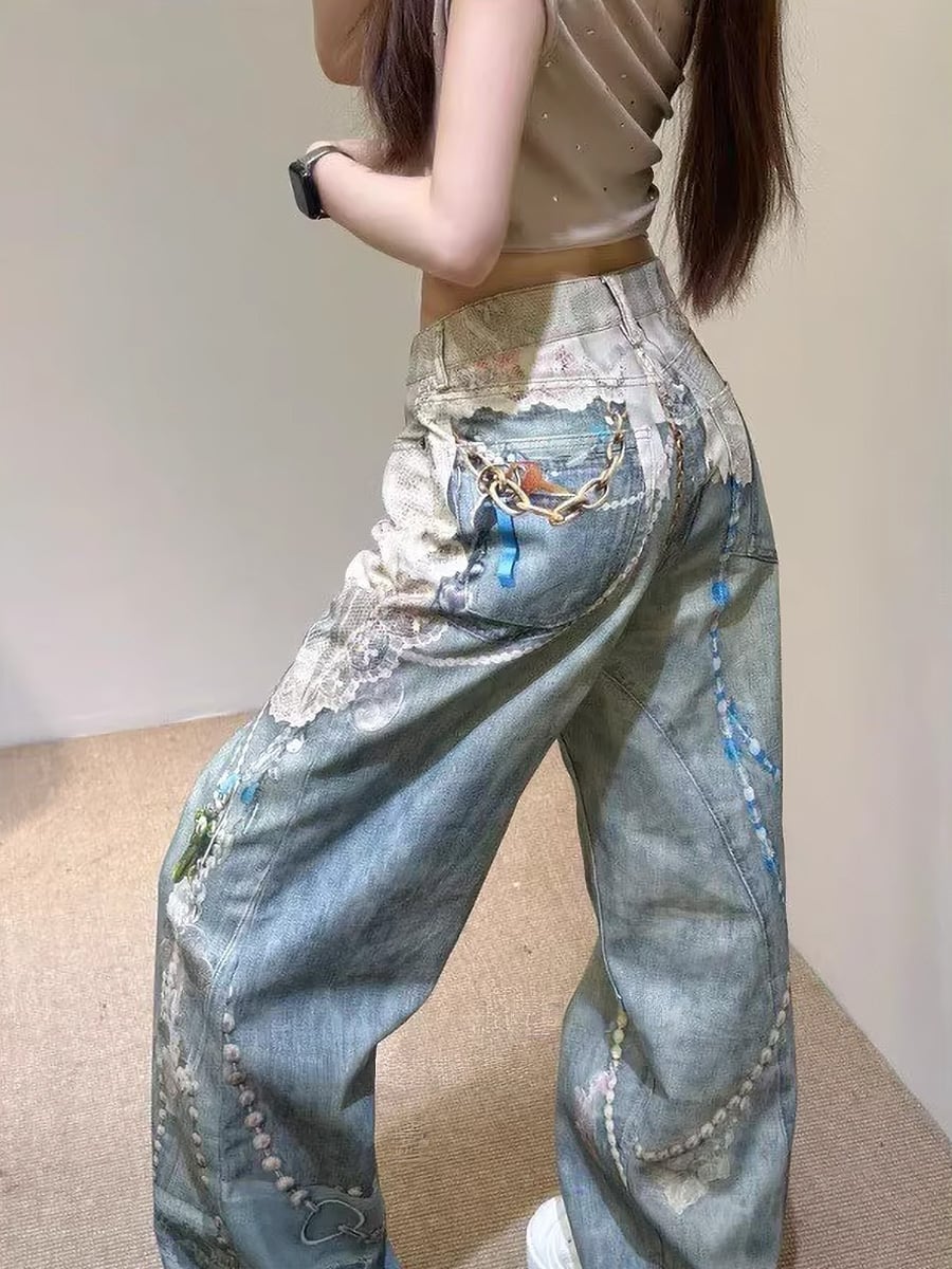 3Dプリントダメージデニムパンツ ダメージパンツ レース リボン パール パールチェーン プリント 宝石プリント ハイウエスト 刺繍 ウォッシュ加工 ダメージ かわいい 大人可愛い きれいめ シンプル カジュアル 大人 ボーイッシュ おしゃれ お洒落 かっこいい 大人可愛い 大人女子 こなれ感 ラフ ラブリー キュート ガーリー 個性的 レディース 通勤 学生 通学 デート お出かけ 公園デビュー リゾート 旅行 韓国コーデ 韓国ファション ブルー ライトブルー