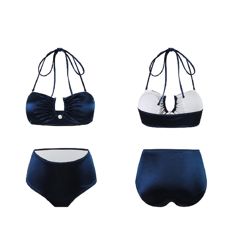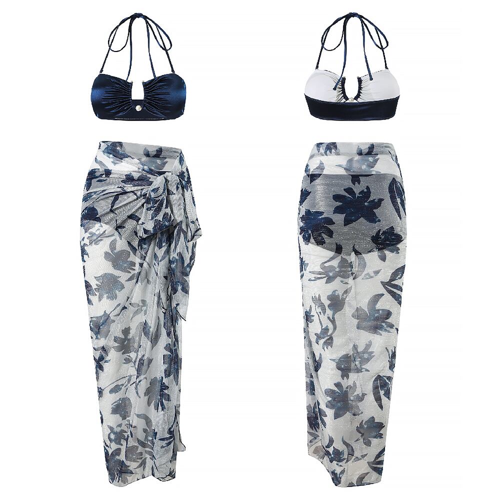 3点セット 水着 ビキニ フロントリングホルターネックフビキニ水着上下+花がらロングパレオ 花柄 ネイビー 紺 濃紺 ダークネイビー パッド付き ノンワーヤー ワイヤーなし 大人っぽい 大人可愛い 上品 高見え 水遊び ビジュー フロントリング ホルターネック ハイウエスト おしゃれ ラブリー 個性的 かっこいい レディース 女性用 ママ ビーチ プール リゾート 旅行 体系カバー 美脚 脚長 スタイルアップ 美スタイル モテ インスタ映え 韓国コーデ 韓国ファッション