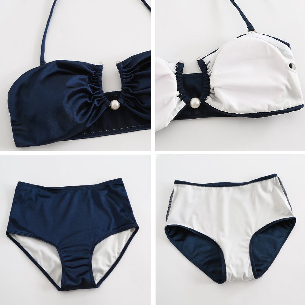 濃いめのネイビーにパールビーズがよく映え、ちょっと大人っぽいデザインですが、パレオは甘さを控えた花がらです。