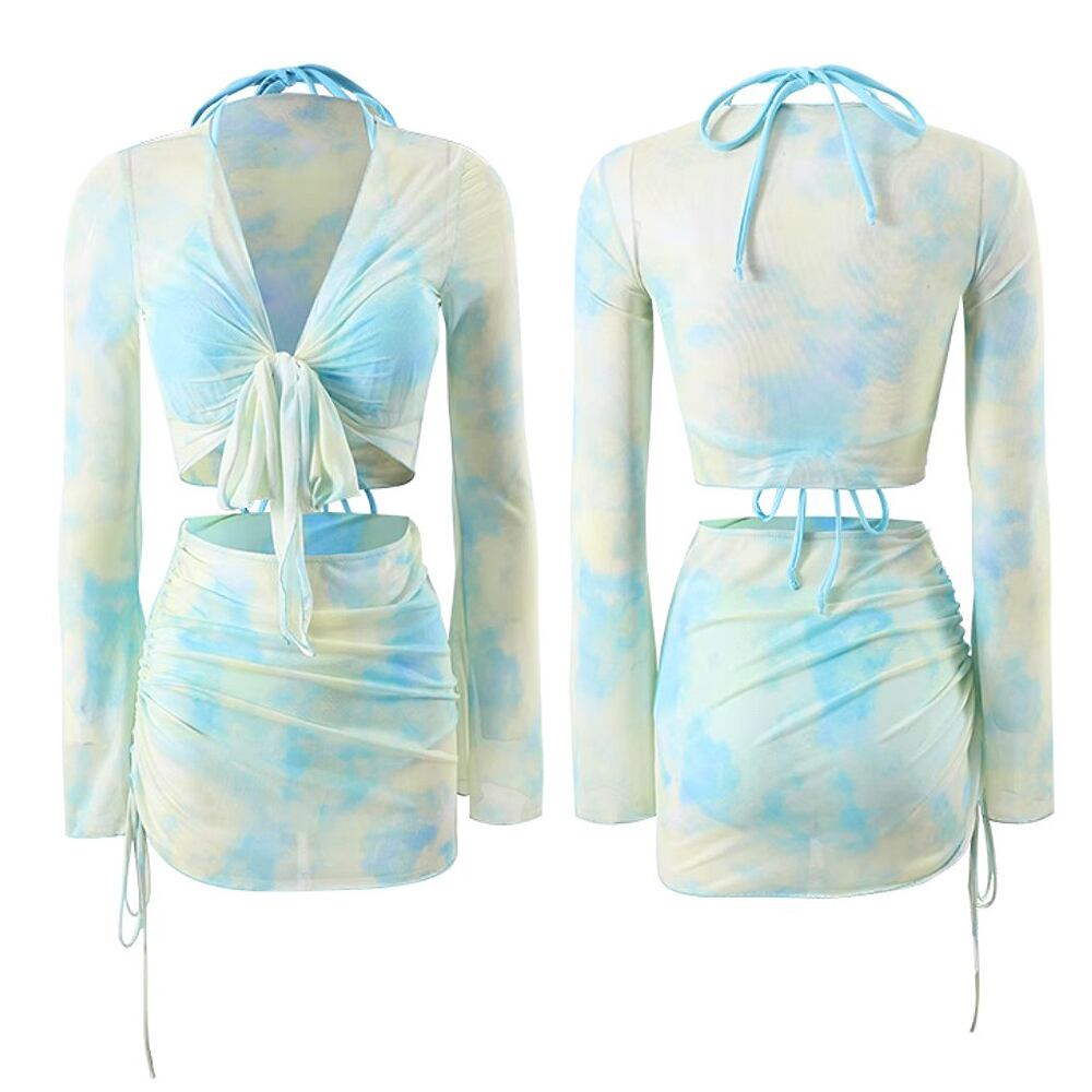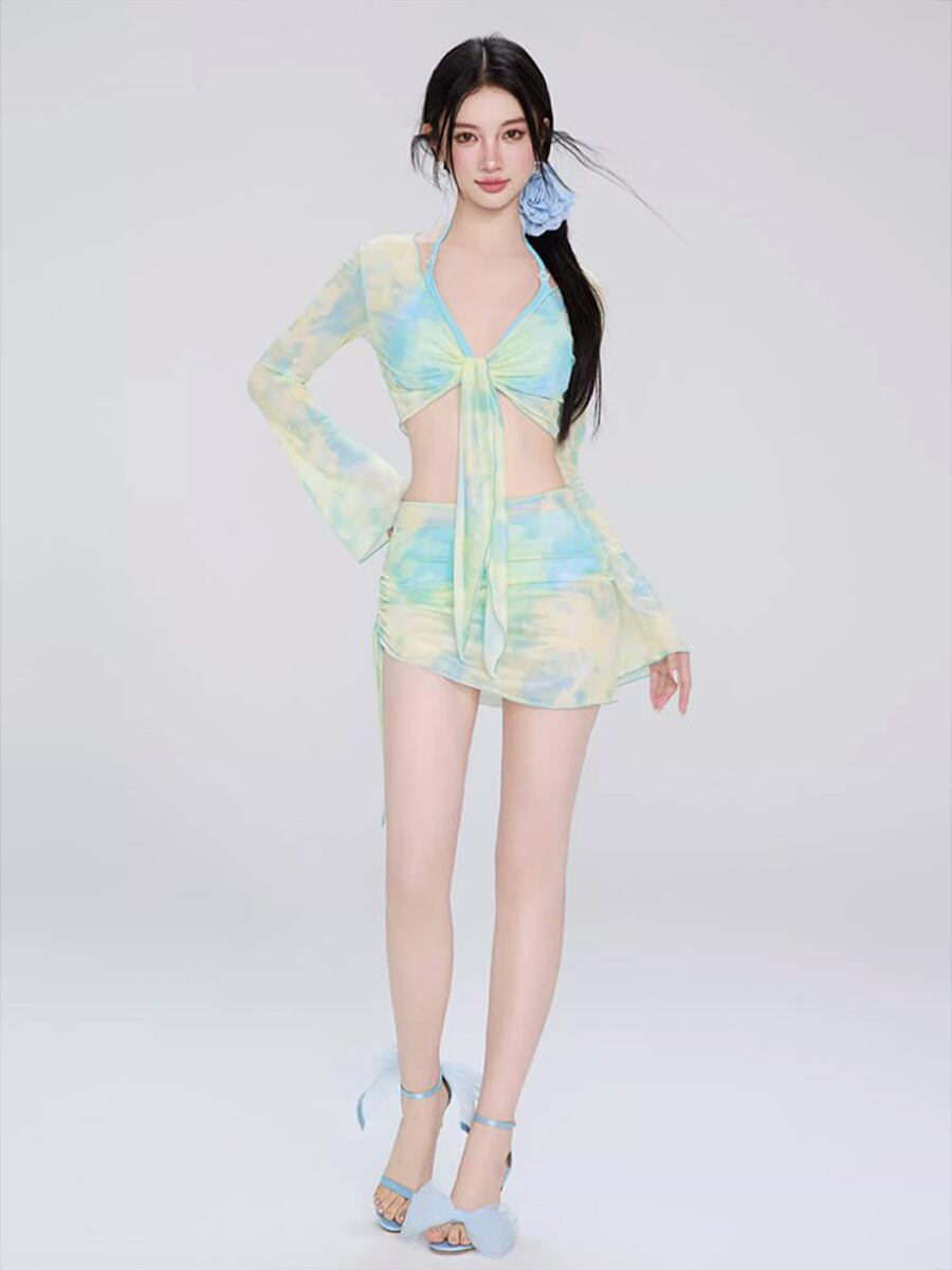 4点セット 水着 ライトブルーホルターネックビキニ水着+長袖ラッシュガード+ パレオ ドロストスカート ビキニ タンキニ 星型チャーム 星型ストラップ スポーティ タイダイカラー タイダイ柄 イエロー ブルー パッド付き かわいい 大人可愛い シンプル 水遊び おしゃれ ラブリー キュート 個性的 かっこいい レディース 女性用 ママ ビーチ プール リゾート 旅行 体系カバー 美脚 脚長 スタイルアップ 美スタイル モテ インスタ映え 韓国コーデ 韓国ファッション