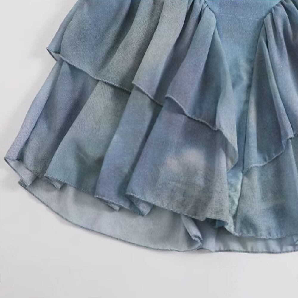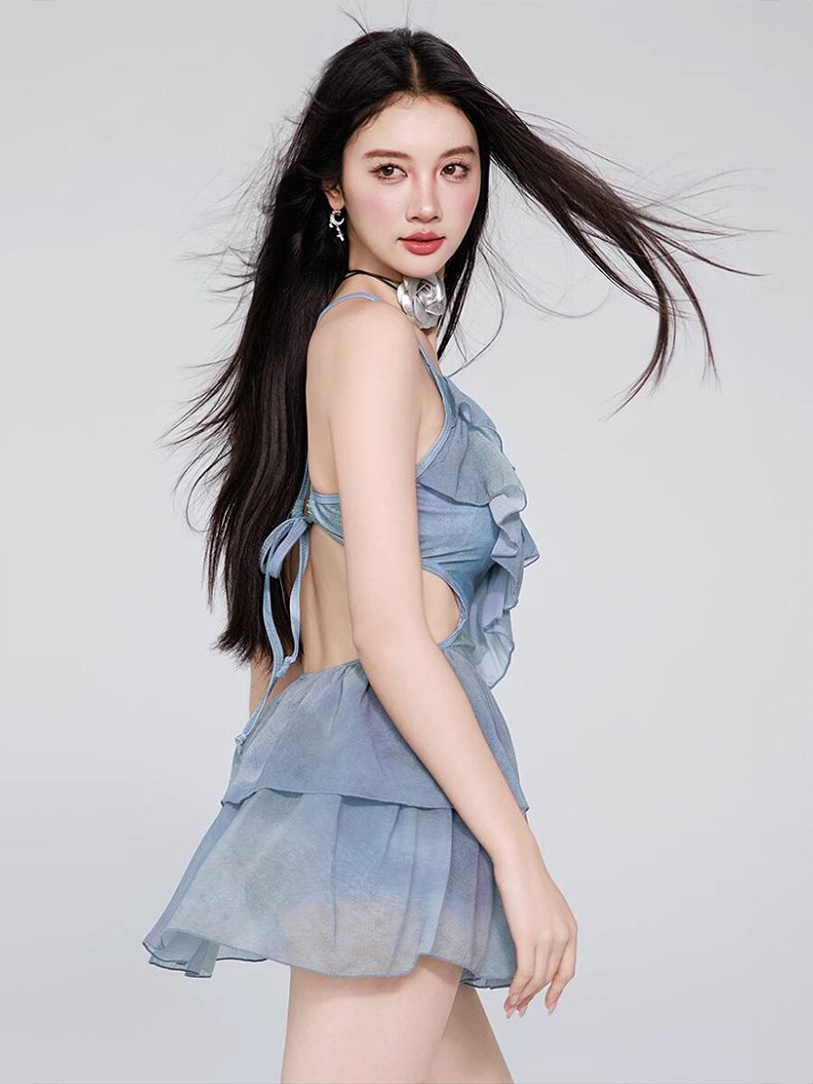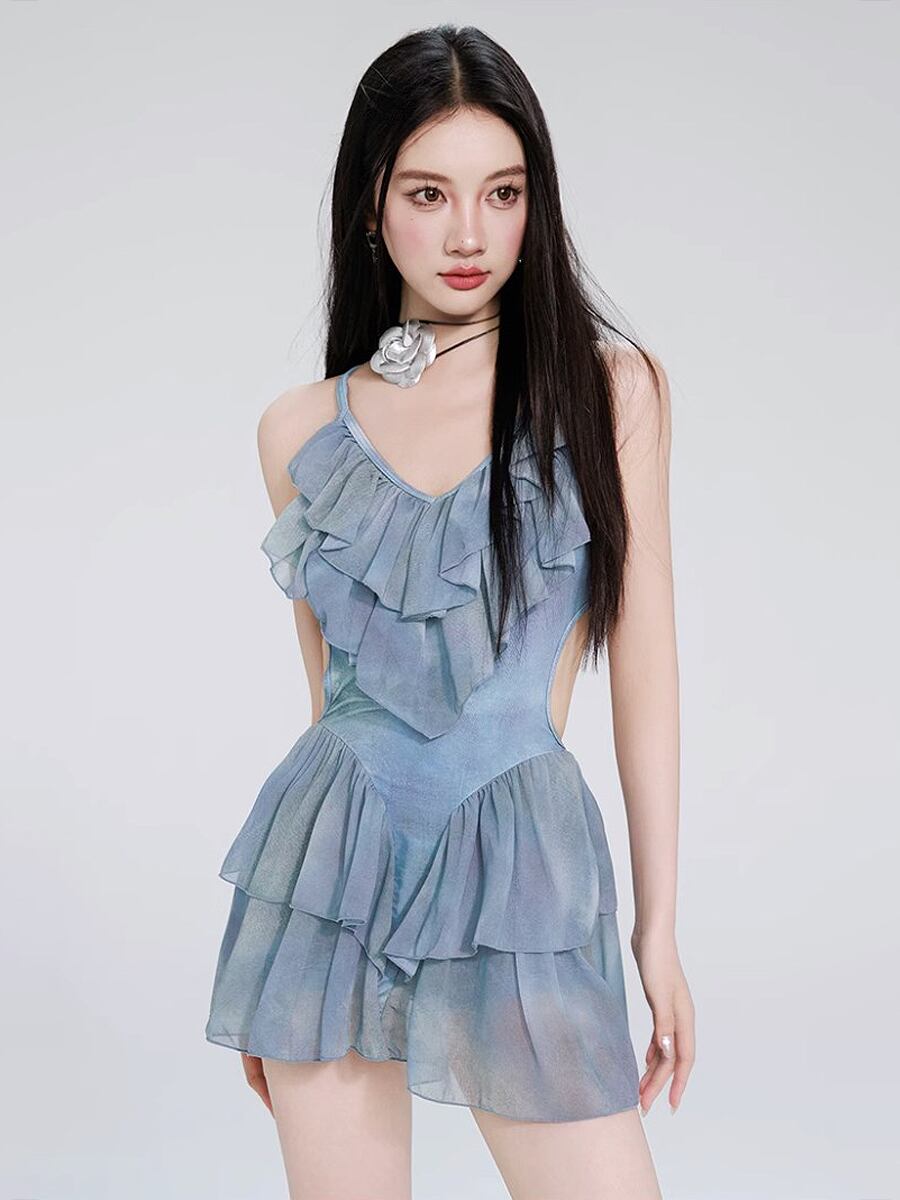 水着 ワンピース水着 ティアードスカート スカート付きワンピース水着 ダブルフリル 背中開き 背中見せ V字ウエスト 胸元アップ パッド付き ボーイレッグ フロントフリル ひらひら フリフリ 青 ブルー タイダイカラー マーブル模様 かわいい 大人可愛い シンプル 水遊び おしゃれ ラブリー キュート 個性的 かっこいい レディース 女性用 ママ ビーチ プール リゾート 体系カバー 美脚 脚長 スタイルアップ 美スタイル モテ インスタ映え 韓国コーデ 韓国ファッション