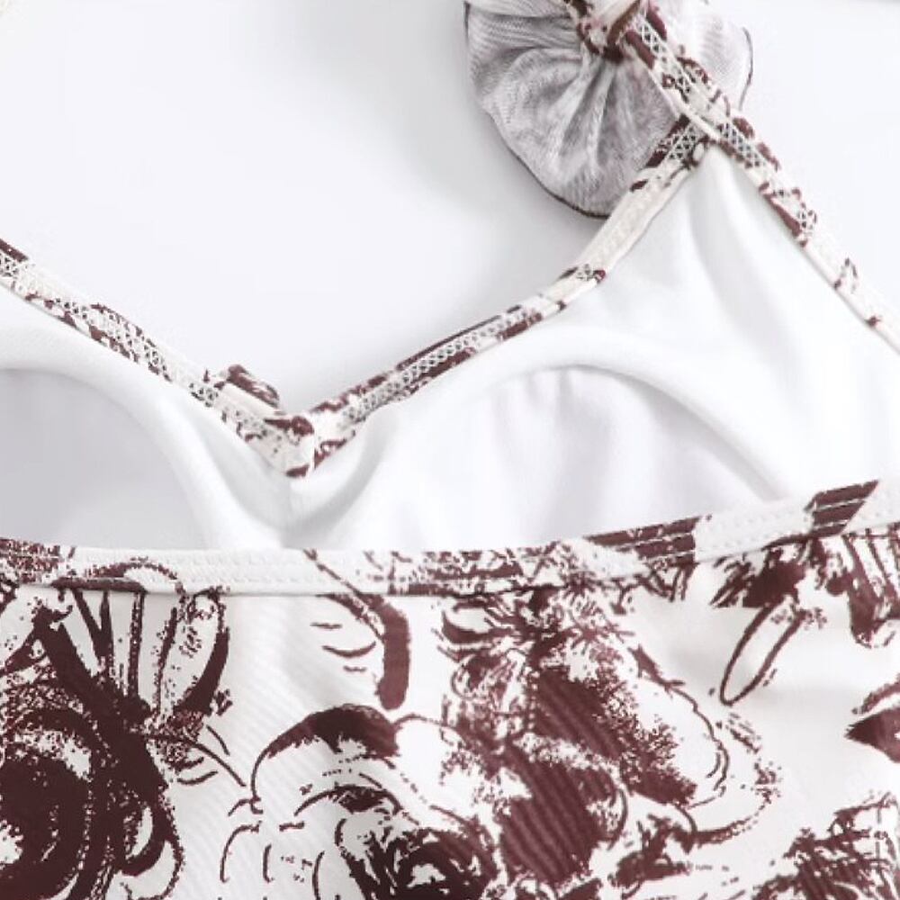 水着 アシンメトリースカート付きワンピース水着 スカート付き ワンピース水着 花柄 茶色 ブラウン 斜めフリル ラッフルリボン ホルターネック 露出控えめ 露出少なめ 胸元アップ パッド付き ひらひら フリフリ フラワープリント モチーフ付き かわいい 大人可愛い 水遊び おしゃれ ラブリー キュート 個性的 かっこいい レディース 女性用 ビーチ プール リゾート 体系カバー 美脚 脚長 スタイルアップ 美スタイル モテ インスタ映え 韓国コーデ 韓国ファッション