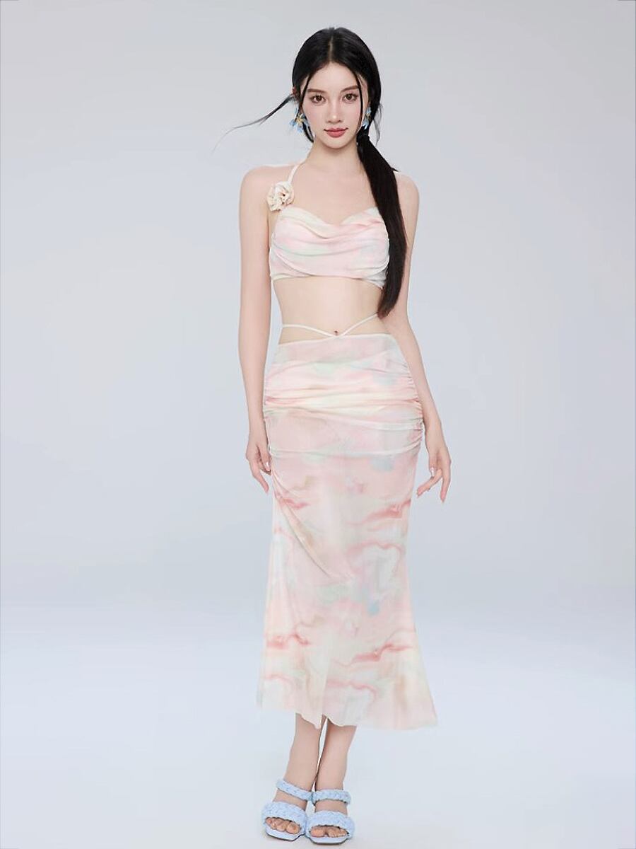 ピンク系タイダイカラーのホルターネックビキニ上下とロングスカートの3点セットです。