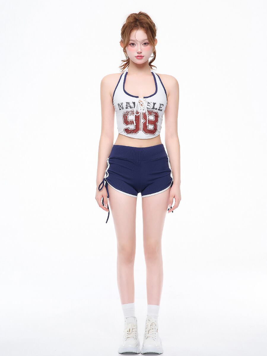 3点セット 水着 ビキニ 数字ロゴホルターネックハイウエストビキニ上下+ショートパンツ セパレート水着 ツーピース スポーティ レイヤード風 重ね着風 ドロスト チアリーダー風 グレー ネイビー 紺 青 フィットネス ネイビー アルファベットプリント サイドドロスト 体型カバー ガーリー きれいめ フェミニン かわいい パッド付き ノンワイヤーなし セット かわいい 大人可愛い きれいめ セクシー おしゃれ スタイリッシュ 美脚 脚長 韓国コーデ 韓国ファション スイムウェア
