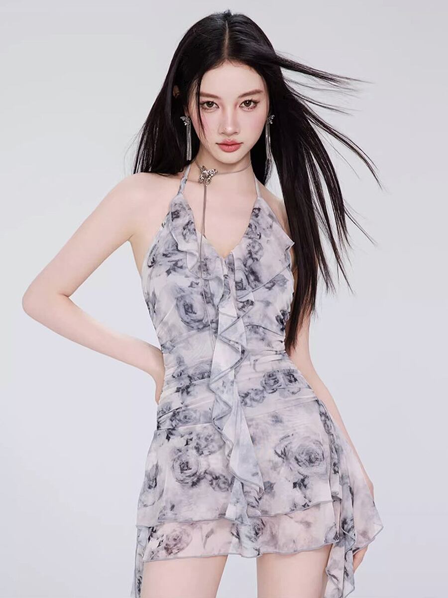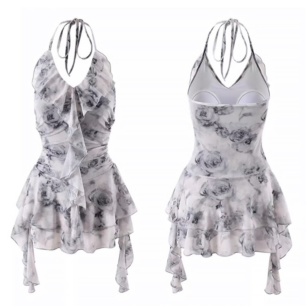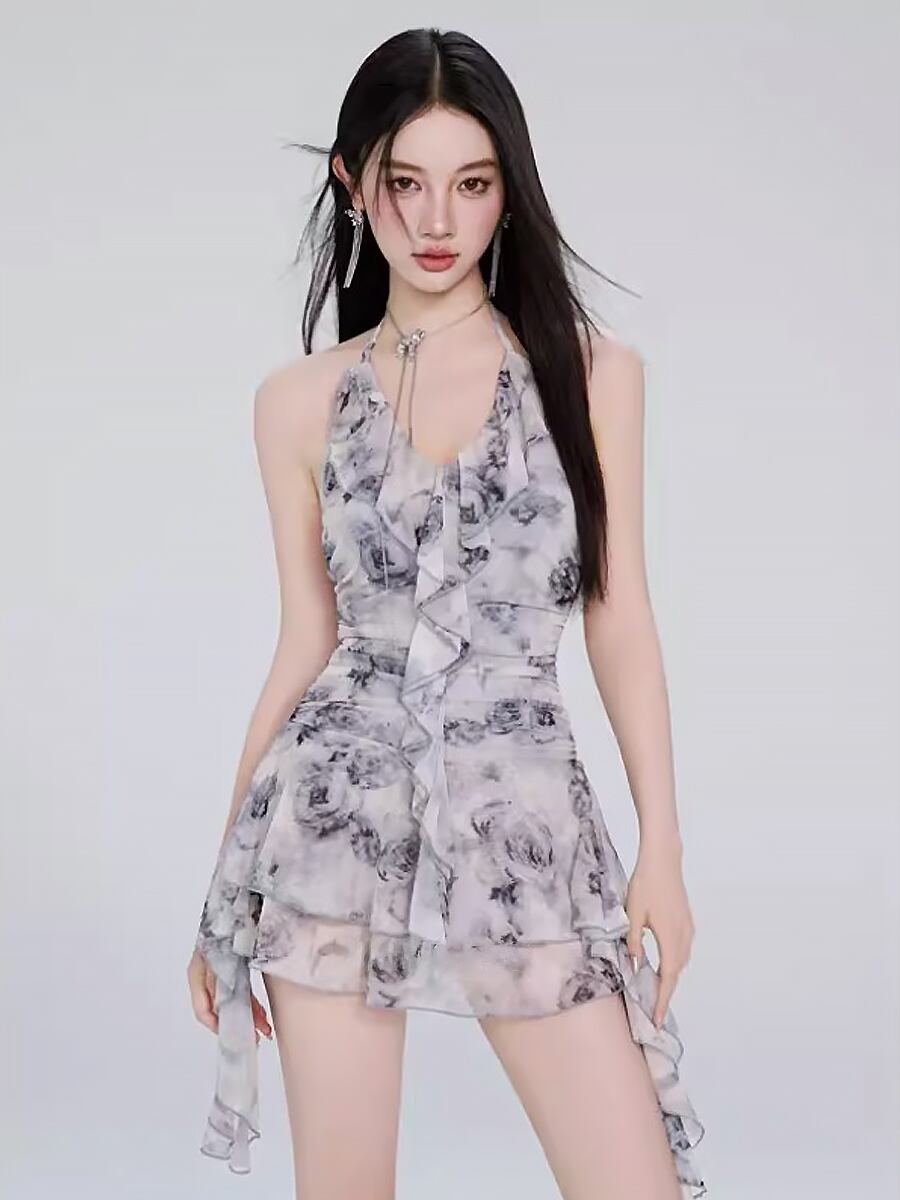 水着 ライトグレーバラ柄ラッフルリボンスカート付きワンピース水着 ワンピース水着 花柄 薔薇柄 バラ柄 段々フリル ティアードスカート ドレープ リボン フリル ひらひらリボン スカート付きワンピース水着 パッド付き すっきり見せ 胸元盛り かわいい 大人可愛い 水遊び おしゃれ ラブリー キュート レディース 女性用 ビーチ プール リゾート 体系カバー 美脚 脚長 スタイルアップ 美スタイル モテ インスタ映え 韓国コーデ 韓国ファッション 灰色 グレー ライトグレー