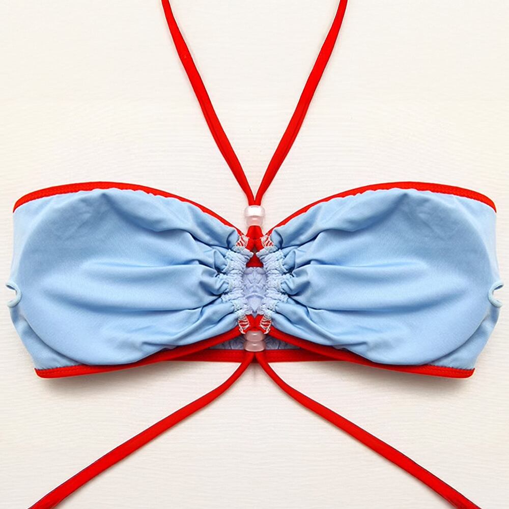ブルーのレッドのパイピンクのビキニはクリスクロスデザインでハイウエスト、長袖のラッシュガードは総レースです。