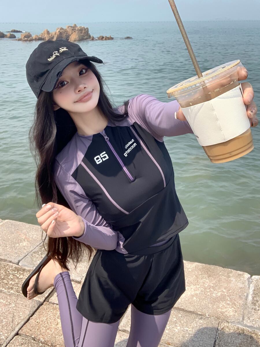 3点セット水着 長袖ハーフジップトップス+ロングパンツ+ショートパンツ スポーティセパレート水着 ビキニ セパレート ダイビング 長袖 猛暑対策 酷暑対策 ラッシュガード水着 ショートパンツ フレア フィットネス パープル ブラック 紫 黒 二の腕カバー 体型カバー スポーティ 水遊び きれいめ フェミニン かわいい パッド付き ワイヤーなし 伸縮性 セット かわいい 大人可愛い きれいめ セクシー おしゃれ スタイリッシュ 美脚 脚長 韓国コーデ 韓国ファション
