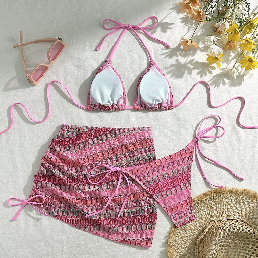 幾何学模様のグラーデションのホルターネックビキニ上下とミニスカートの3点セットです。