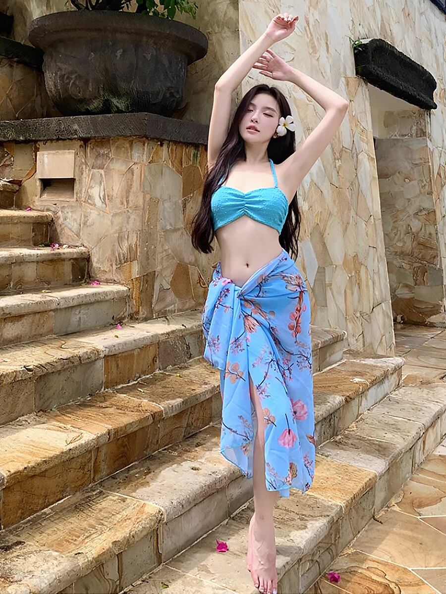 明るめカラーのビキニ上下と大きめの花柄パレオの3点セットです。