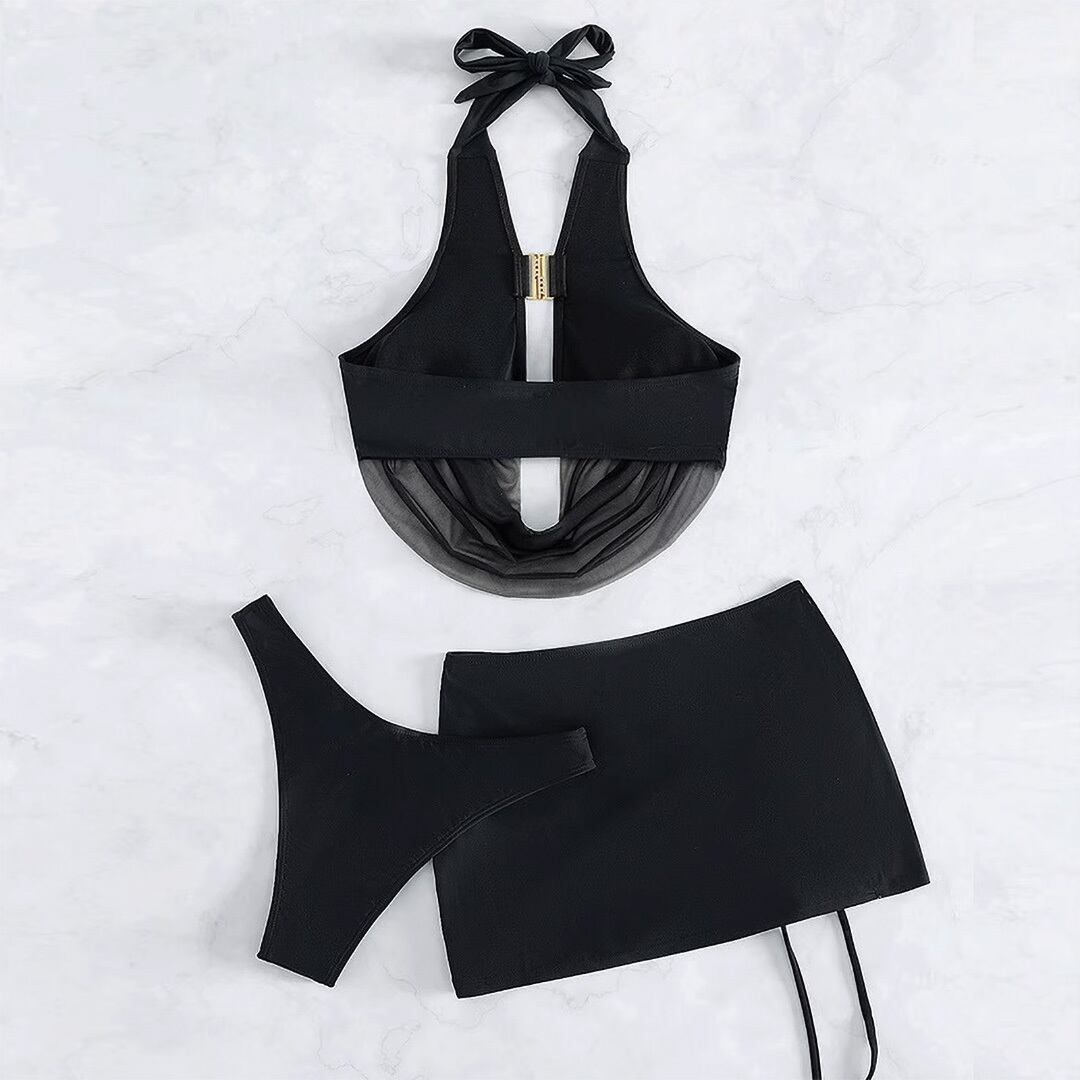 胸のドレープが優雅でセクシーなビキニ上下とドロストスカートの3点セットです。