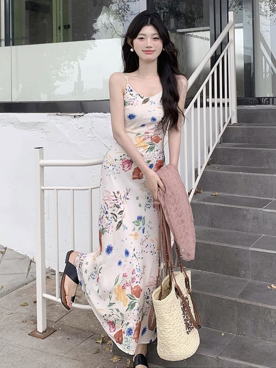 明るい花柄プリントのキャミソールロングワンピースです。
