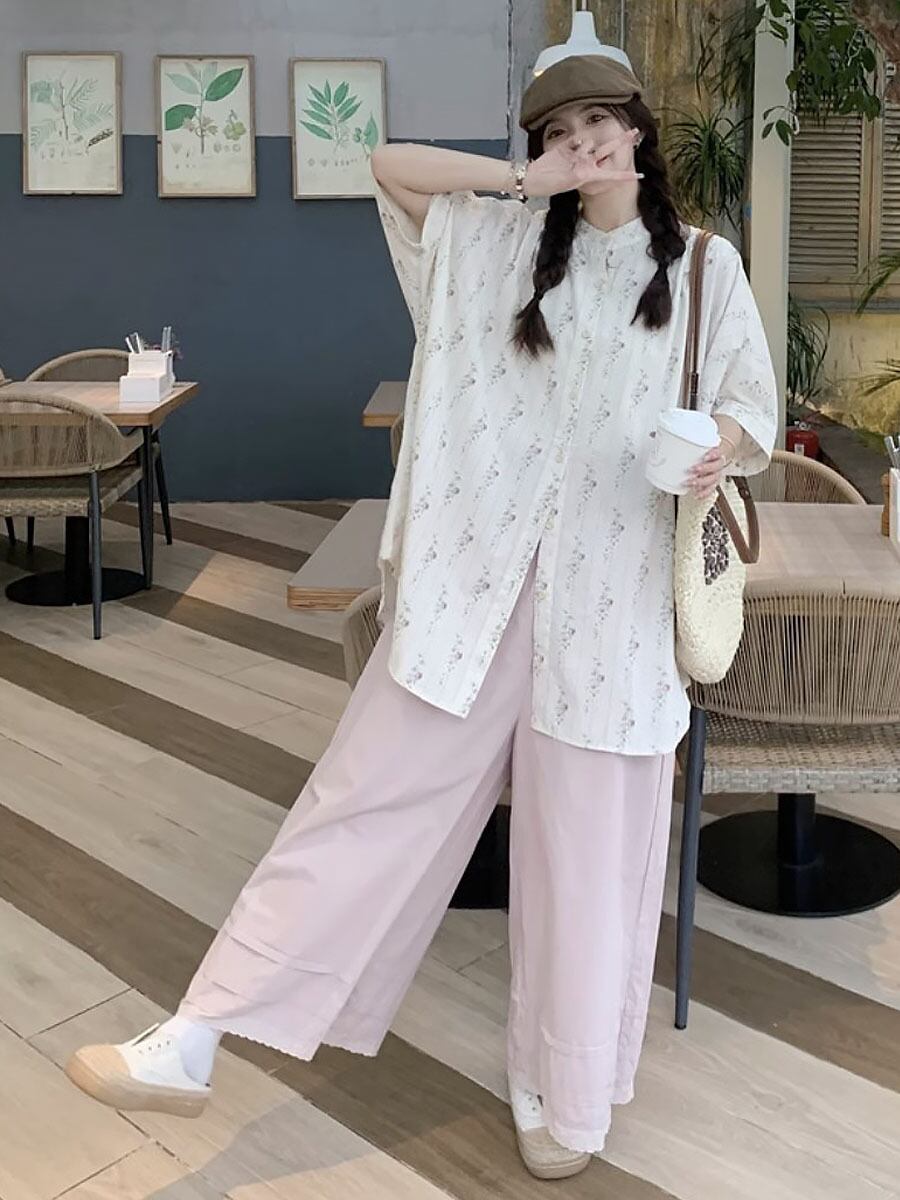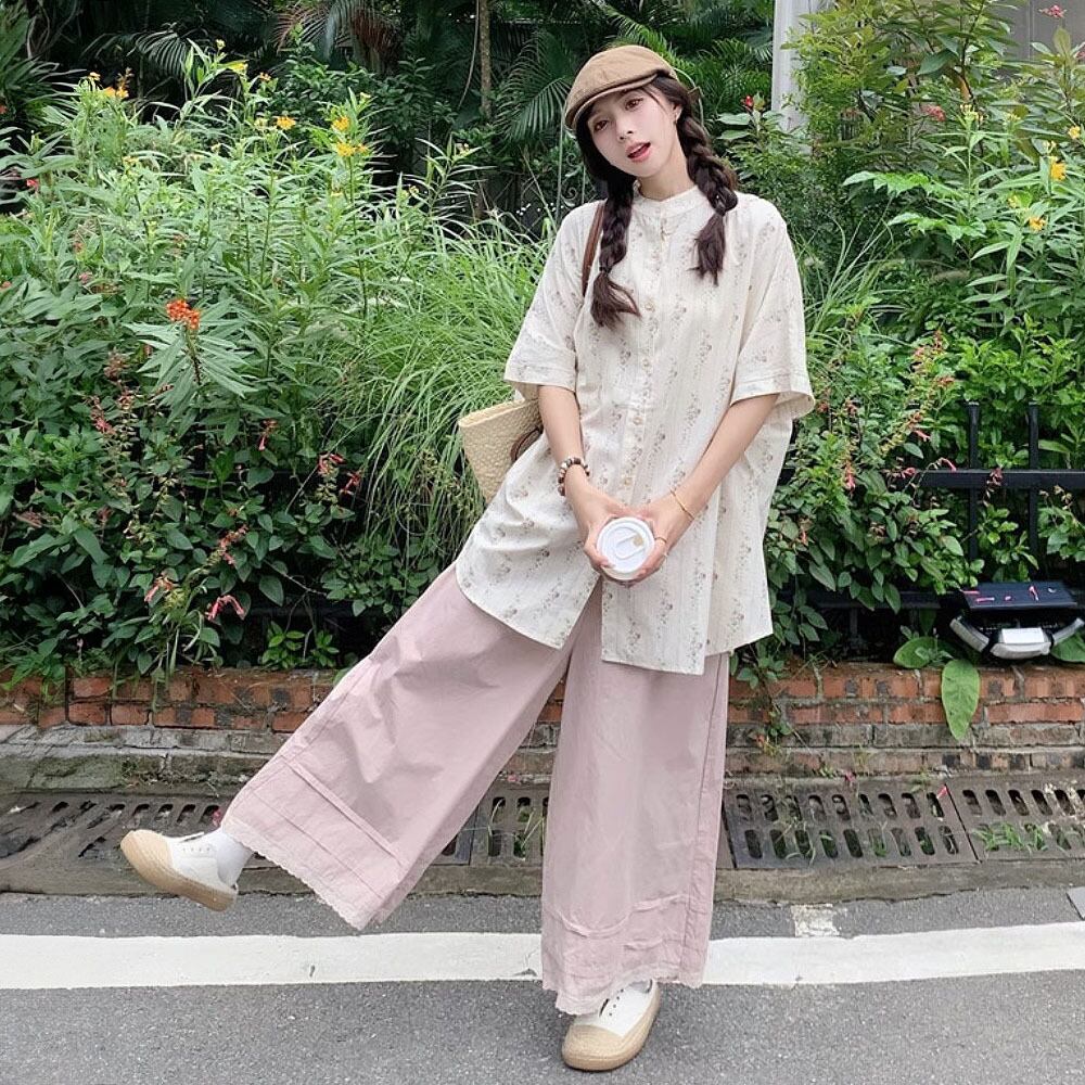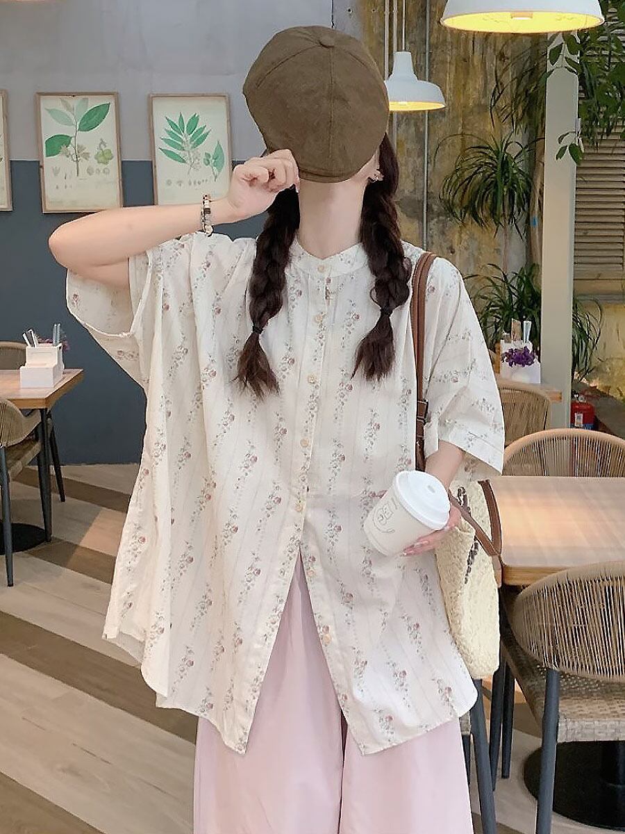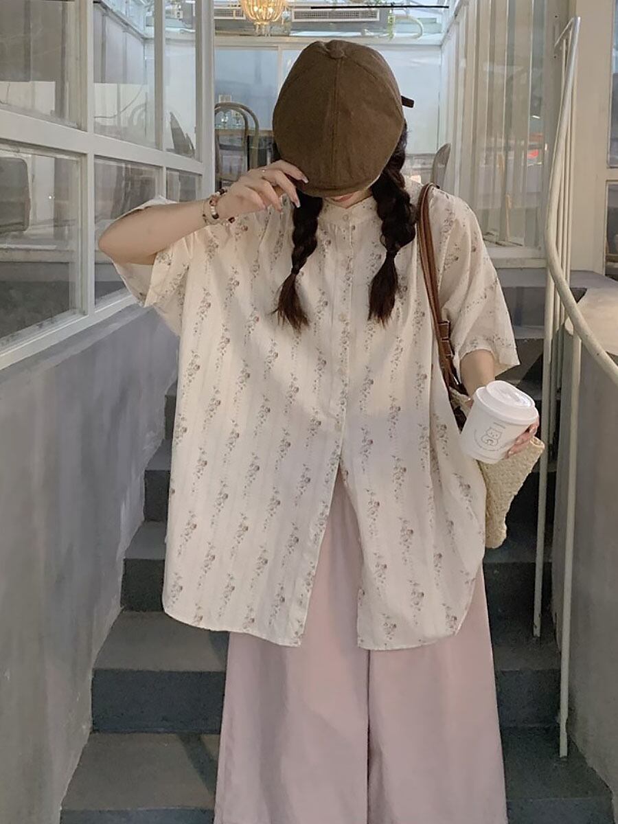 オーバーサイズノーカラー半袖シャツブラウス ビッグシャツ オーバーサイズシャツ サマーブラウス ブラウス シャツ 襟なし オーバーサイズ 裾長め ゆったり ロング ラウンドネック 小花柄 花柄 フラワープリント ゆとりあり 楽ちん 締めつけ感なし かわいい 大人可愛い きれいめ シンプル 上品 おしゃれ お洒落 かっこいい レトロ 大人女子 こなれ感 ラブリー ガーリー 個性的 モード系 エレガント 韓国コーデ 韓国ファッション ピンク オフホワイト ワイド