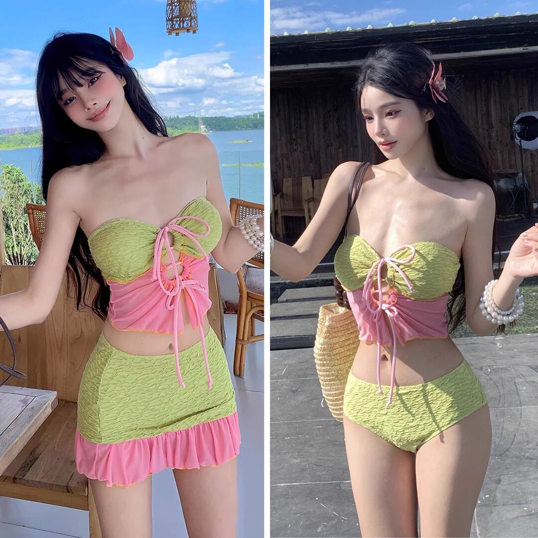 3点セット 水着 ビキニ マカロンカラーチューブトップビキニ上下+ミニスカート ピンク グリーン ライトグリーン 緑 黄緑 チューブトップ ベアトップ 肩紐なし 肩出し マカロンカラー レースアップ風 キーホール風 ダブルキーホール フレンチデザイン フランス風 パット付き ワイヤーなし ノンワイヤー かわいい ガーリー 大人可愛い 大人っぽい おしゃれ ラブリー キュート レディース 女の子 海 ビーチ プール リゾート 美脚 脚長 着痩せ 韓国系 オルチャン 韓国ファション 韓国コーデ