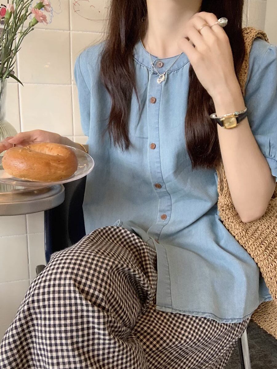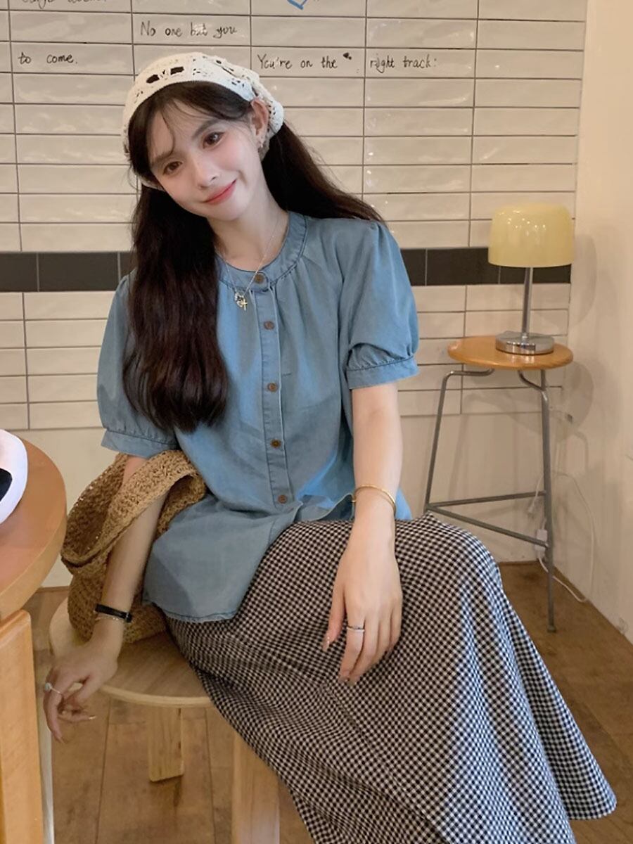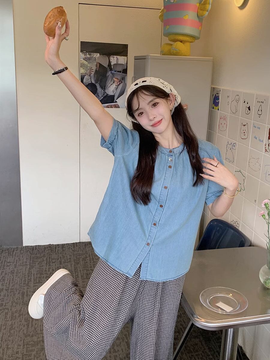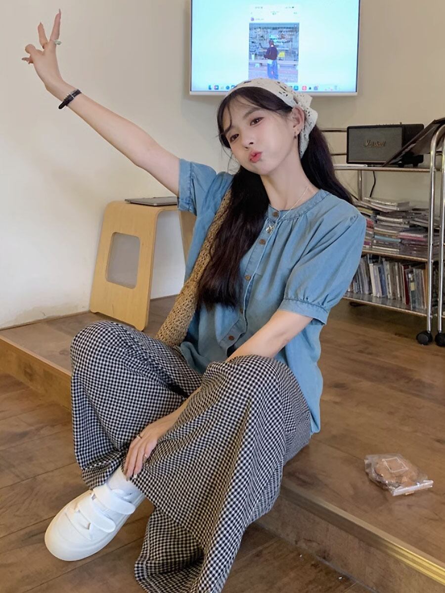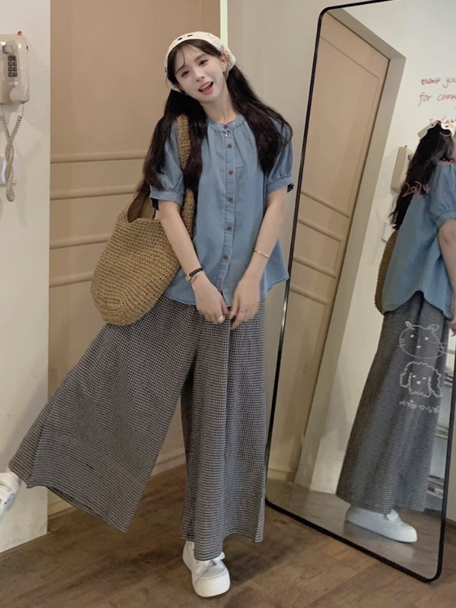 2点セット サマーデニムブラウス+チェック柄ワイドロングパンツ セットアップ ブルー デニム サマーデニム 襟なし ノーカラーブラウス シャツ 半袖 オーバーサイズ フレアパンツ ハイウエスト ウエストゴム チェック チェック柄 格子柄 ルーズ ワイド かわいい 大人可愛い シンプル カジュアル 大人 上品 おしゃれ お洒落 かっこいい 大人可愛い 大人女子 こなれ感 ラフ キュート ガーリー 個性的 レディース リゾート 韓国コーデ 韓国ファション ブルー ライトブルー 青 黒