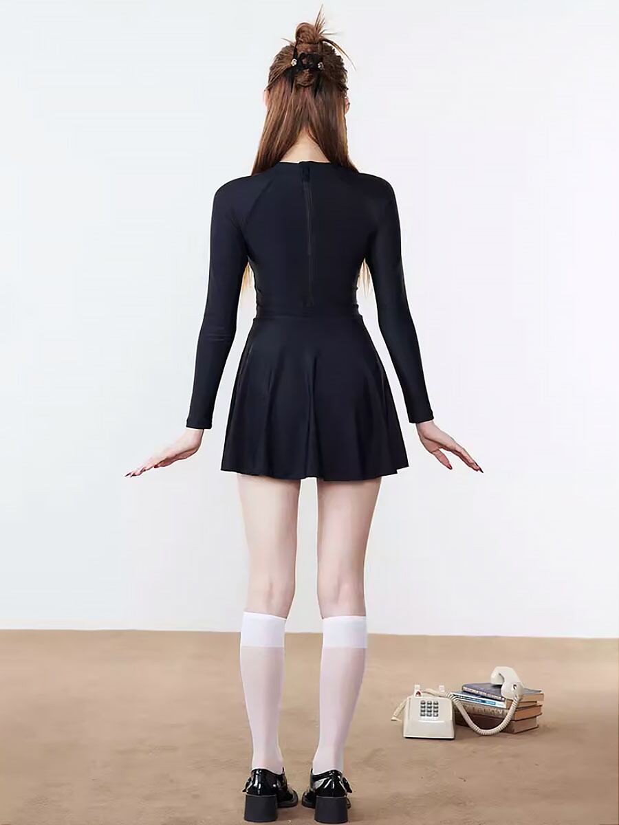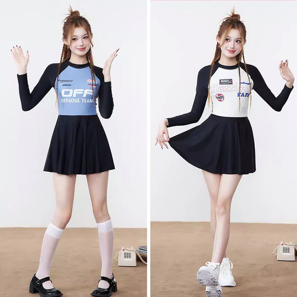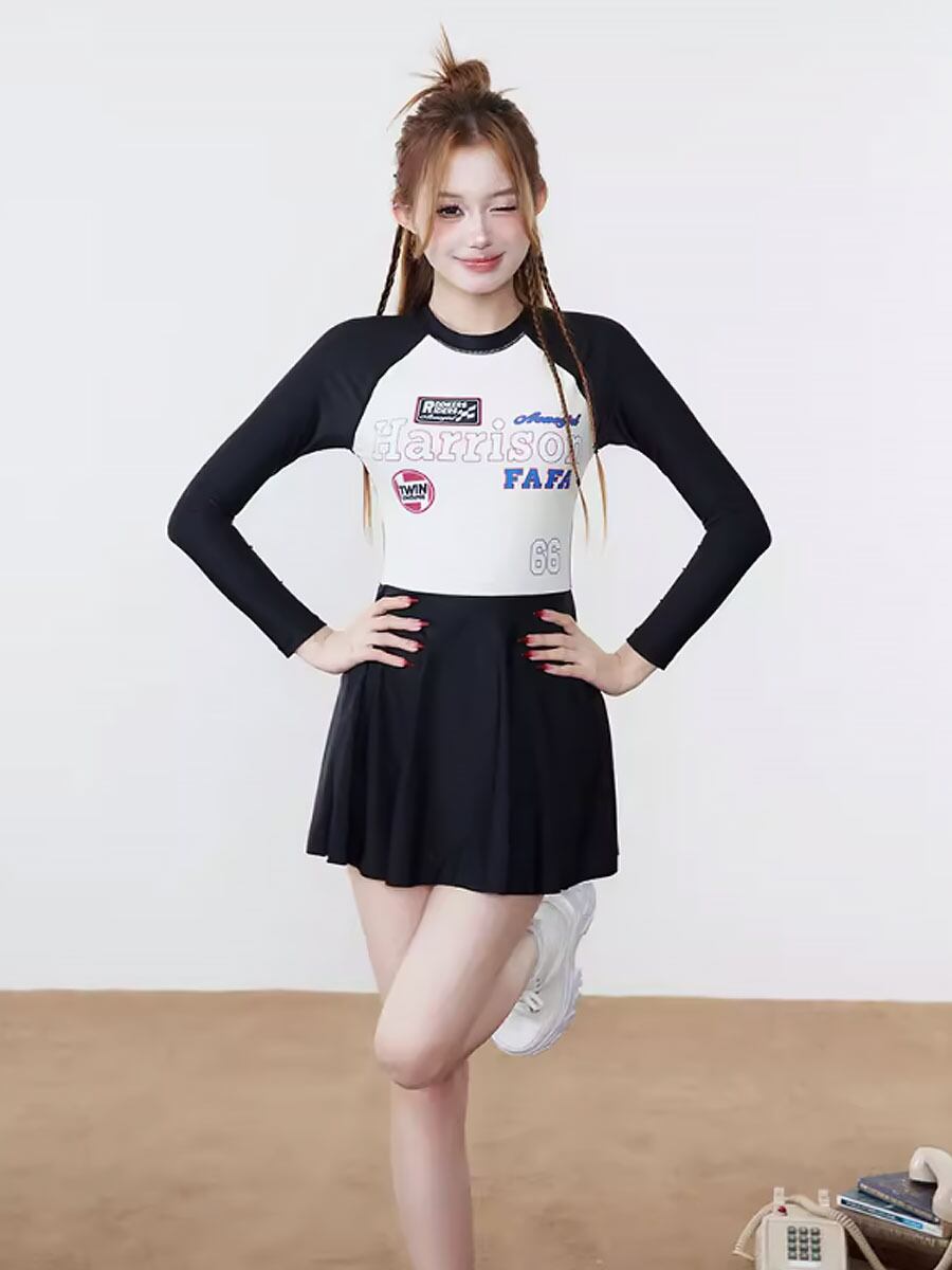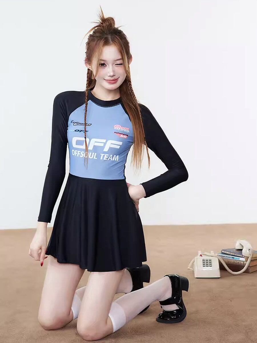 全2色 水着 長袖ジップアップスカート付きワンピース水着 スポーティ ラッシュガード ジップアップ 無地 長袖 パット付き フレアスカート スポーティ ロゴ アメリカンロゴ 切り替えデザイン ラウンドネック かわいい オールインワン おしゃれ お洒落 主役級 ラブリー キュート ガーリー ブラック レディース 日焼け防止 露出少なめ 露出控えめ 海 ビーチ プール リゾート 美脚 脚長 着痩せ 韓国系 ホワイト ブルー ブラック 白 黒 青 大きいサイズ 韓国コーデ 韓国ファッション