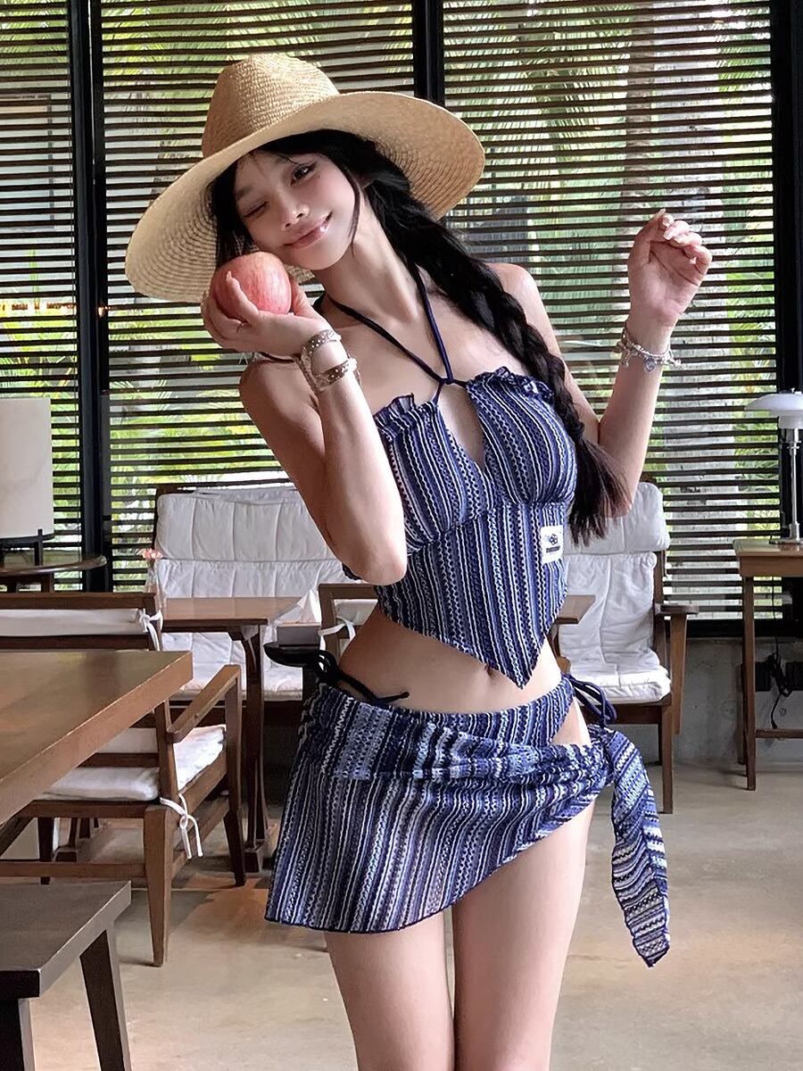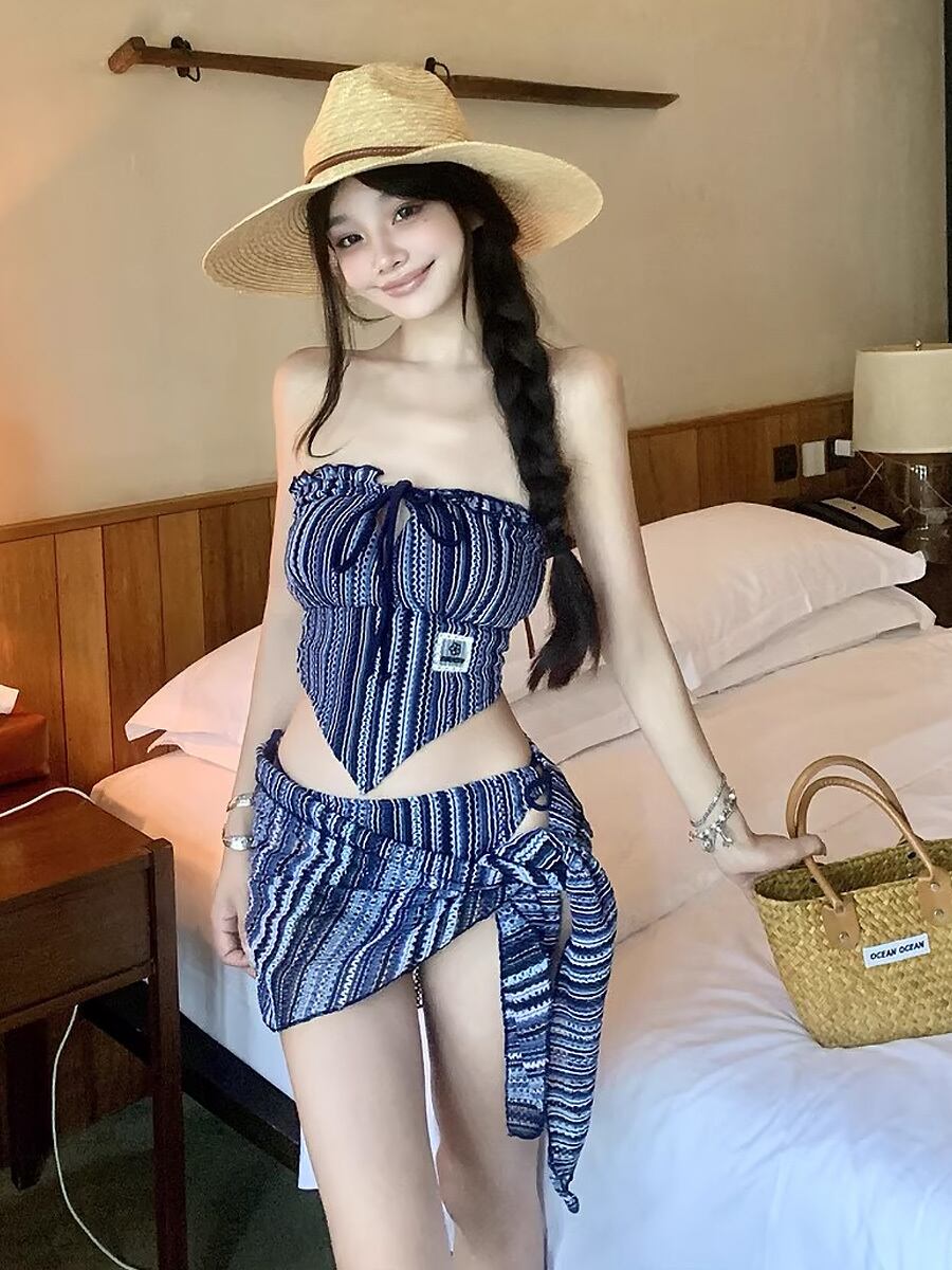 3点セット 水着 ビキニ 2wayホルターネックビキニトップス+タイサイドボトム+パレオ 紐ビキニ タイサイドビキニ ホルターネック チューブトップ ベアバック セクシー 紐ビキニ インディゴブルー ブルー 青 シマシマ ストライプ タイサイド ガーリー きれいめ フェミニン かわいい パッド付き ノンワイヤーなし セット かわいい 大人可愛い きれいめ おしゃれ スタイリッシュ 美脚 脚長 韓国コーデ 韓国ファション スイムウェア