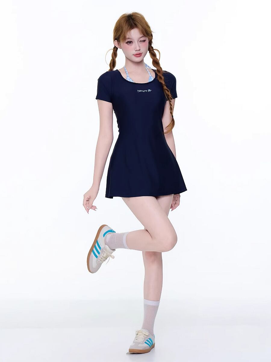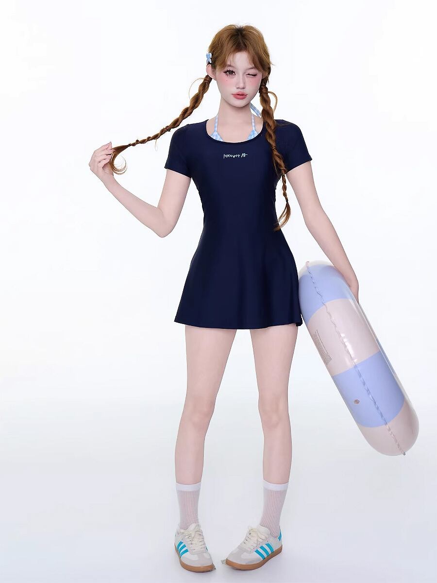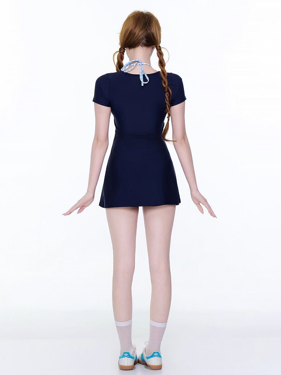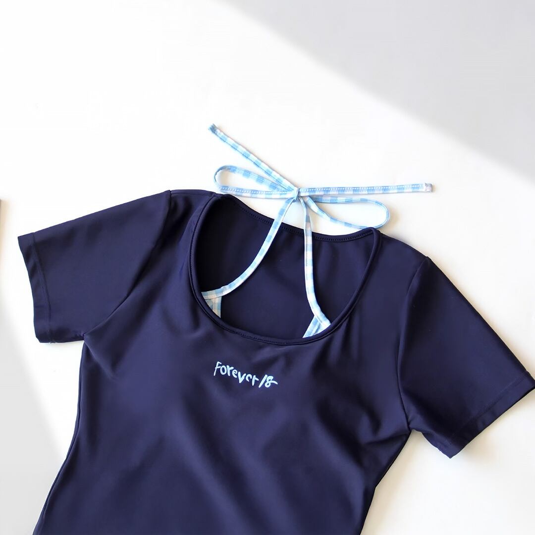 水着 セパレート ショート袖ワンピース風セパレート水着 ツーピース水着 袖付き レイヤード風 重ね着風 ホルターネック風 ボーイレングス ボーイレッグ ネックバックリボン ボーイレッグパンツ ダミーレイヤード水着 セパレート水着 ネイビー 紺色 濃紺 露出少なめ 露出控えめ 日焼け防止 露出度少なめ かわいい 大人可愛い ラブリー 温泉 レディース ツーピース 海 ビーチ プール リゾート スパ スポーツクラブ 水遊び 着痩せ 韓国系 オルチャン オルチャン 韓国コーデ 韓国ファッション