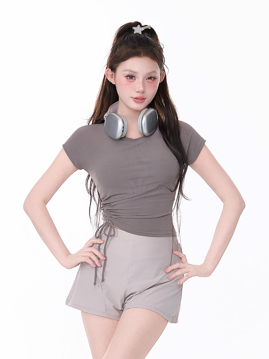 水着 セパレート サイドドロストツーピース水着 セパレート水着 ボーイレッグパンツ サイドドロスト ラグラン袖 袖付き 半袖 ショート丈袖 ウエスト細見え ショートパンツデザイン 露出度少なめ ハイウエスト かわいい 大人可愛い ラブリー キュート 灰色 グレー ライトグレー 薄灰色 温泉 レディース ツーピース 海 ビーチ プール リゾート スパ スポーツクラブ 水遊び 美脚 脚長 着痩せ 韓国系 オルチャン オルチャン 韓国コーデ 韓国ファッション