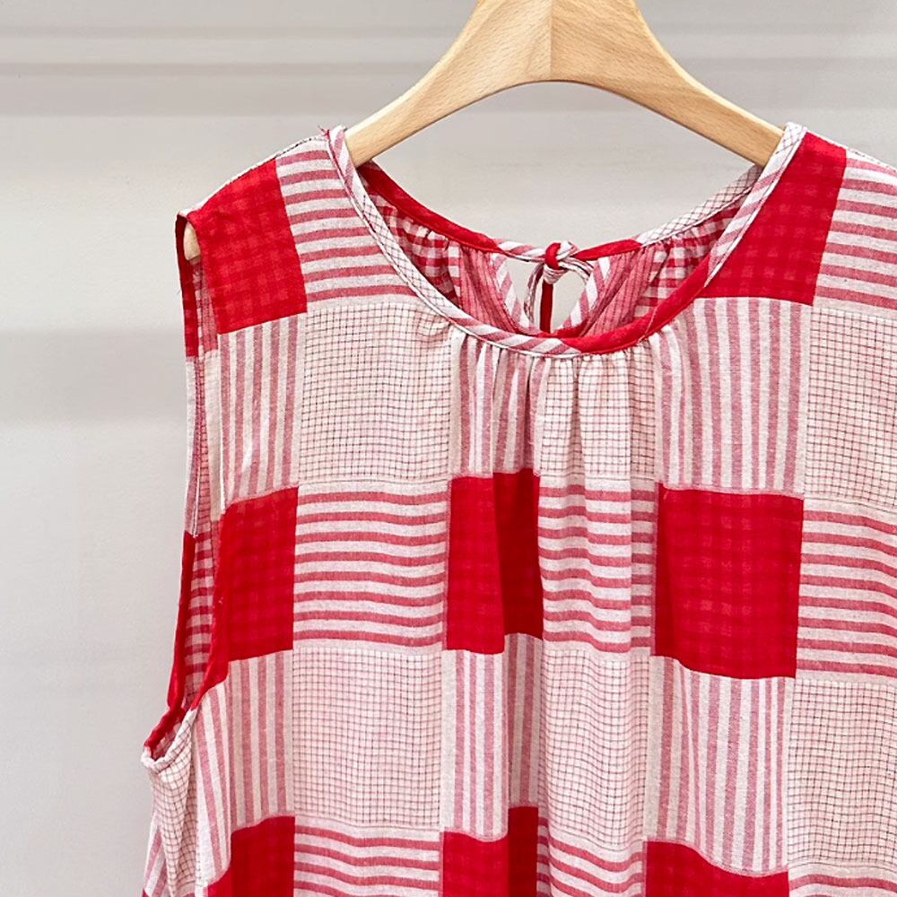 レッドのチェックが可愛いノースリーブのすとんとした夏ワンピースです。