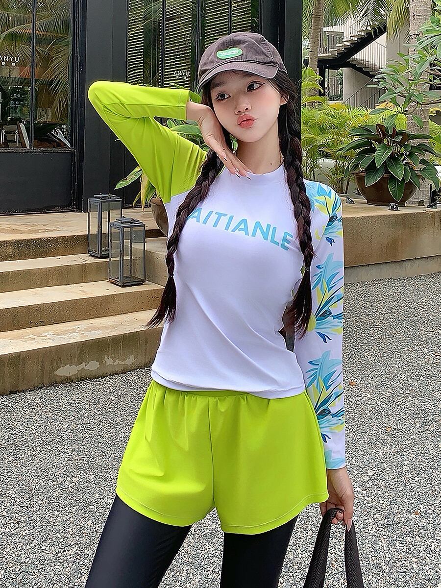 ラグランスリーブの長袖トップスとショートパンツがドッキングされたロングパンツのツーピース水着です。