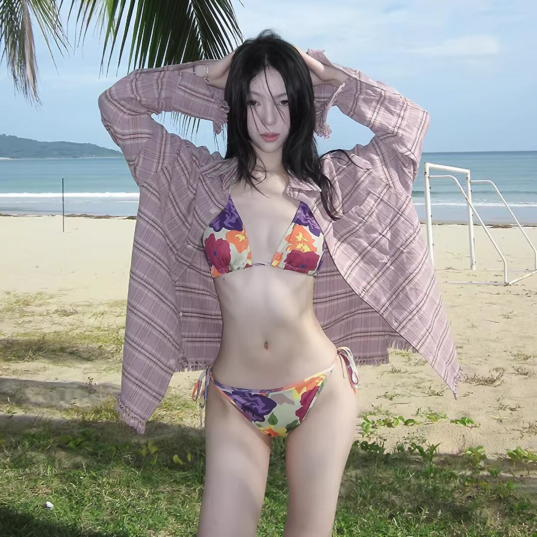 パープルやオレンジの落ち着き感のあるマルチカラーの花柄の紐ビキニです。