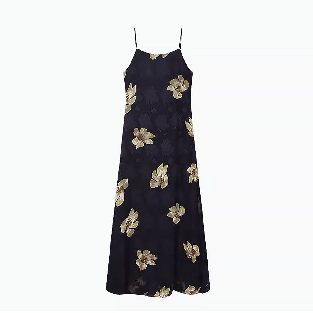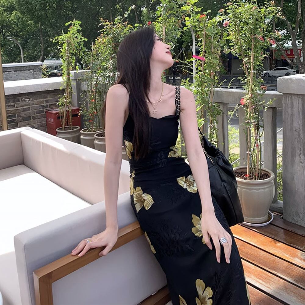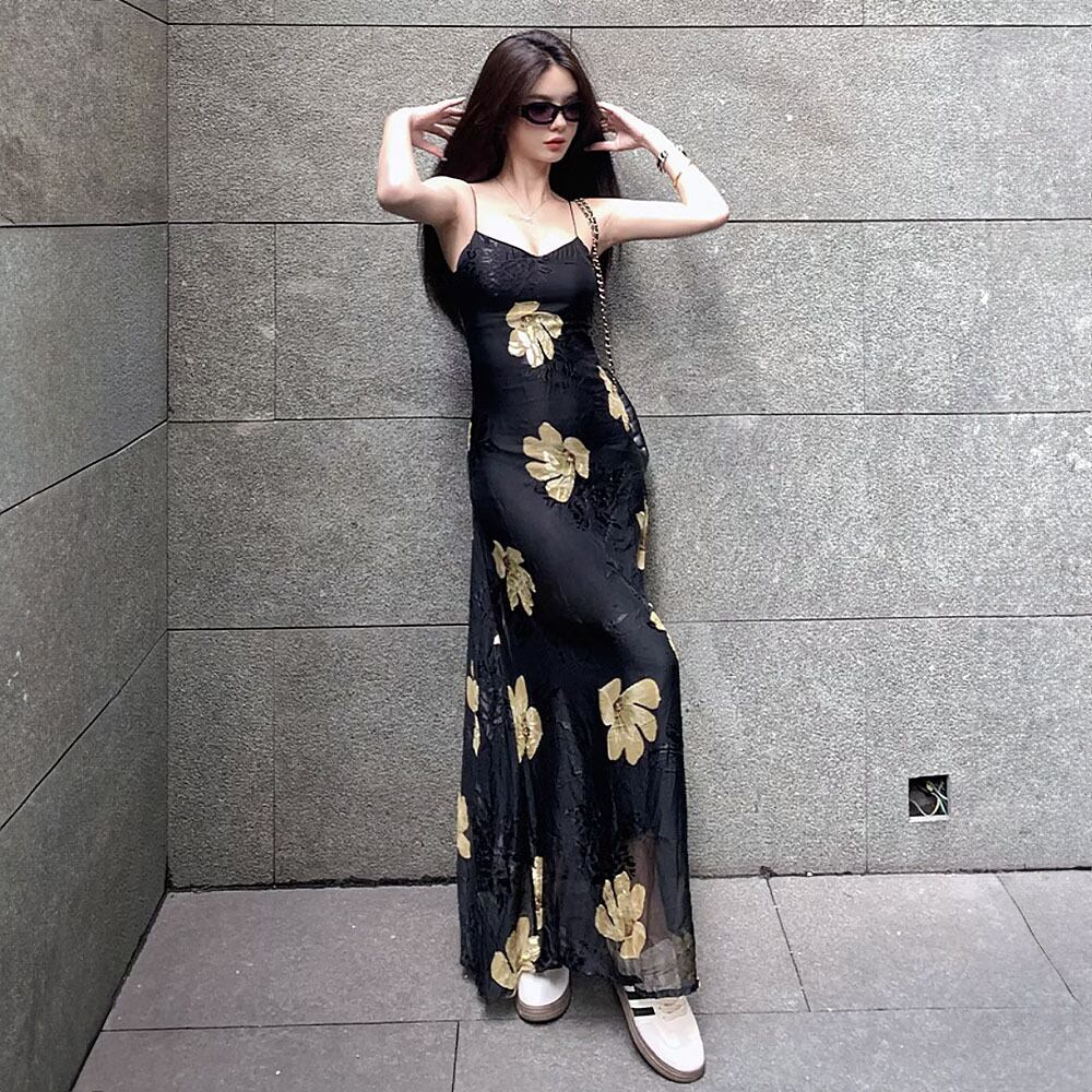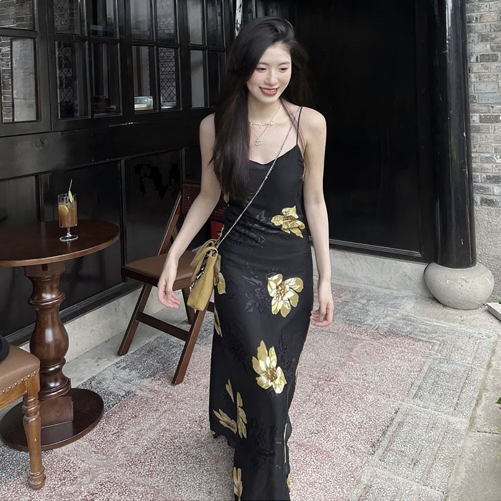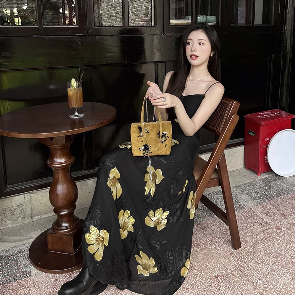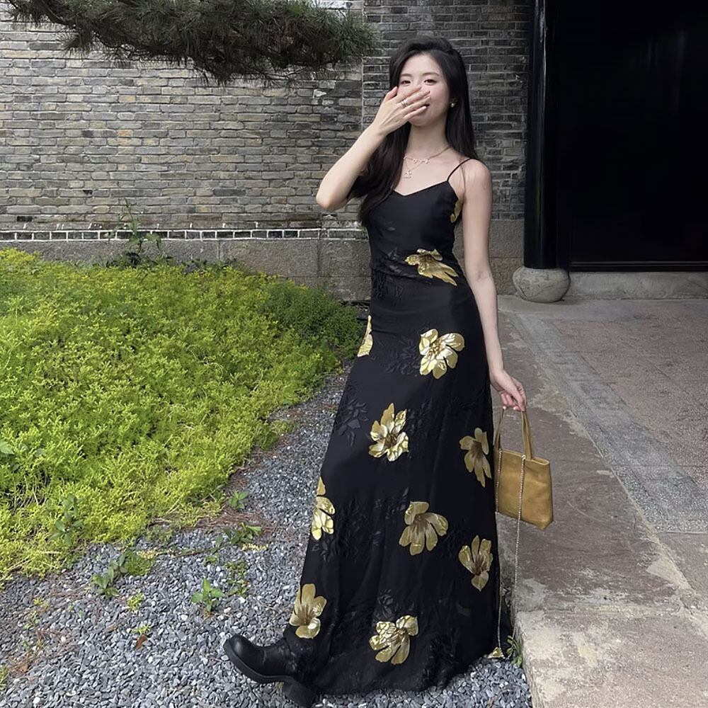 Vネックブラックキャミソールワンピース スパゲッティストラップ 花柄 ワンピース 黒 ブラック イエロー 黄色 ドレス キャミワンピ リゾートワンピース パーティドレス Aライン レトロ 夏ワンピース サマーワンピース サマードレス ロング ロングワンピース 涼しげ ゆったり 楽ちん オシャレ ガーデンパーティ パーティ 大人女子 こなれ感 ラブリー キュート 体型カバー エレガント モダン 主役級 抜け感 お出かけ 韓国コーデ 韓国ファッション
