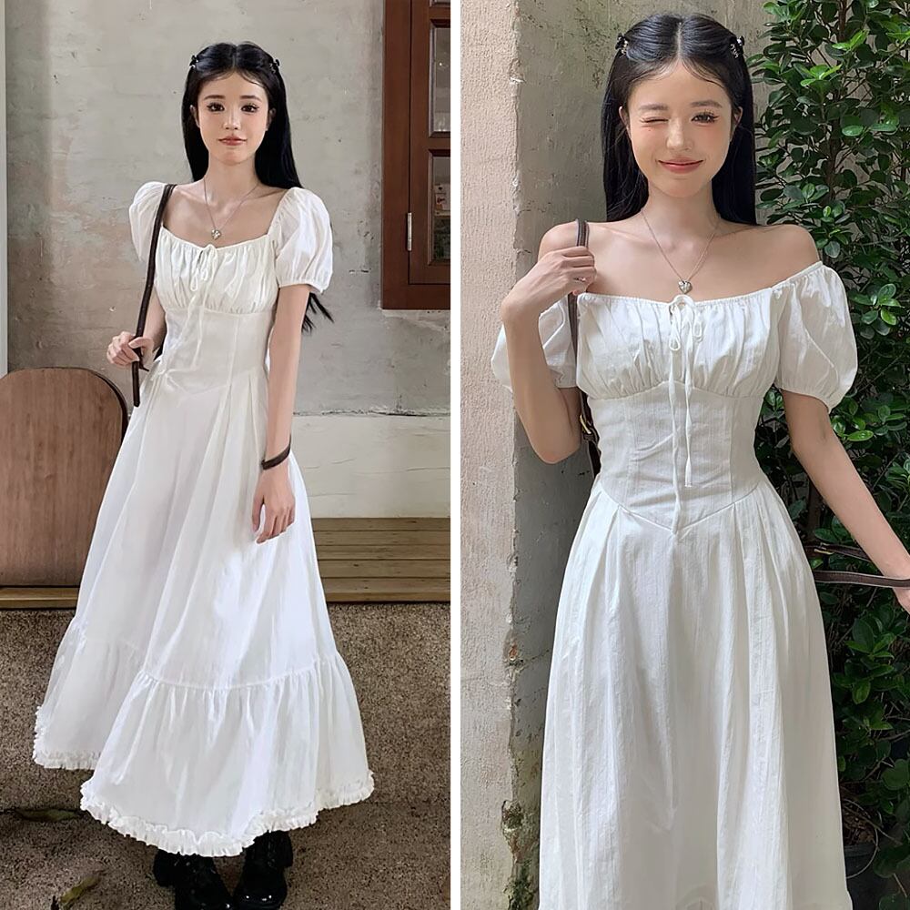 ビスチェ風オフショルワンピース ホワイト 白 フリル レース ワンピース ドレス ビスチェ風 胸元リボン リゾートワンピース Aライン レトロ 夏ワンピース サマーワンピース サマードレス ロング ロングワンピース 涼しげ ゆったり 楽ちん オシャレ ガーデンパーティ パーティ 大人女子 こなれ感 ラブリー キュート 体型カバー エレガント モダン 主役級 抜け感 お出かけ 韓国コーデ 韓国ファッション