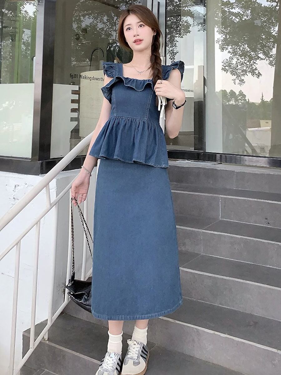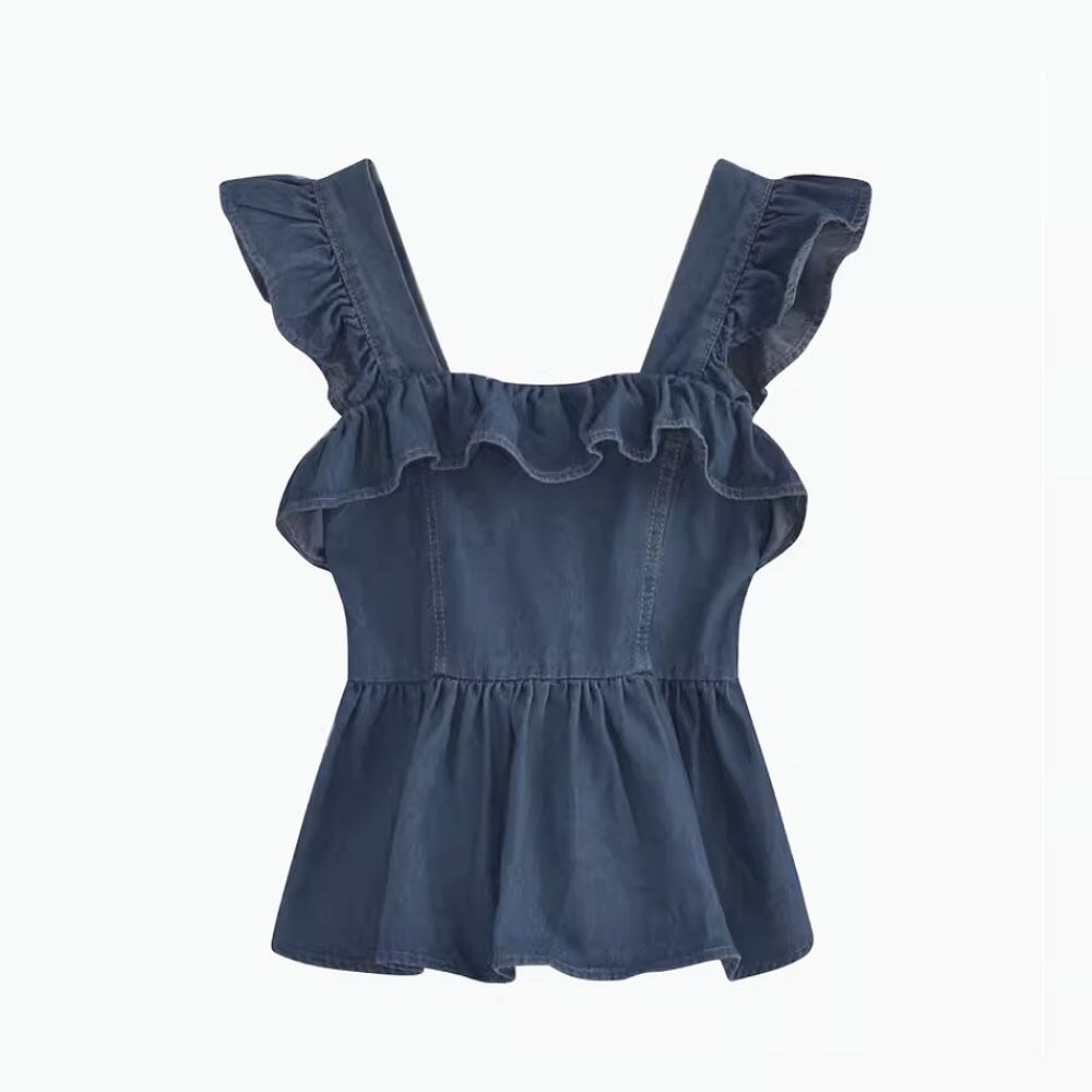 キャミソール デニムへプラムキャミソール へプラム フリル フライングショルダー風 バックシャーリング シャーリング ソフトフィット 体系カバー サマーデニム デニム 裾広がり お腹カバー かわいい 大人可愛い きれいめ シンプル 上品 おしゃれ お洒落 かっこいい レトロ 大人女子 こなれ感 ラブリー ガーリー 個性的 モード系 エレガント 韓国コーデ 韓国ファッション 青 ブルー インディゴブルー デニムブルー