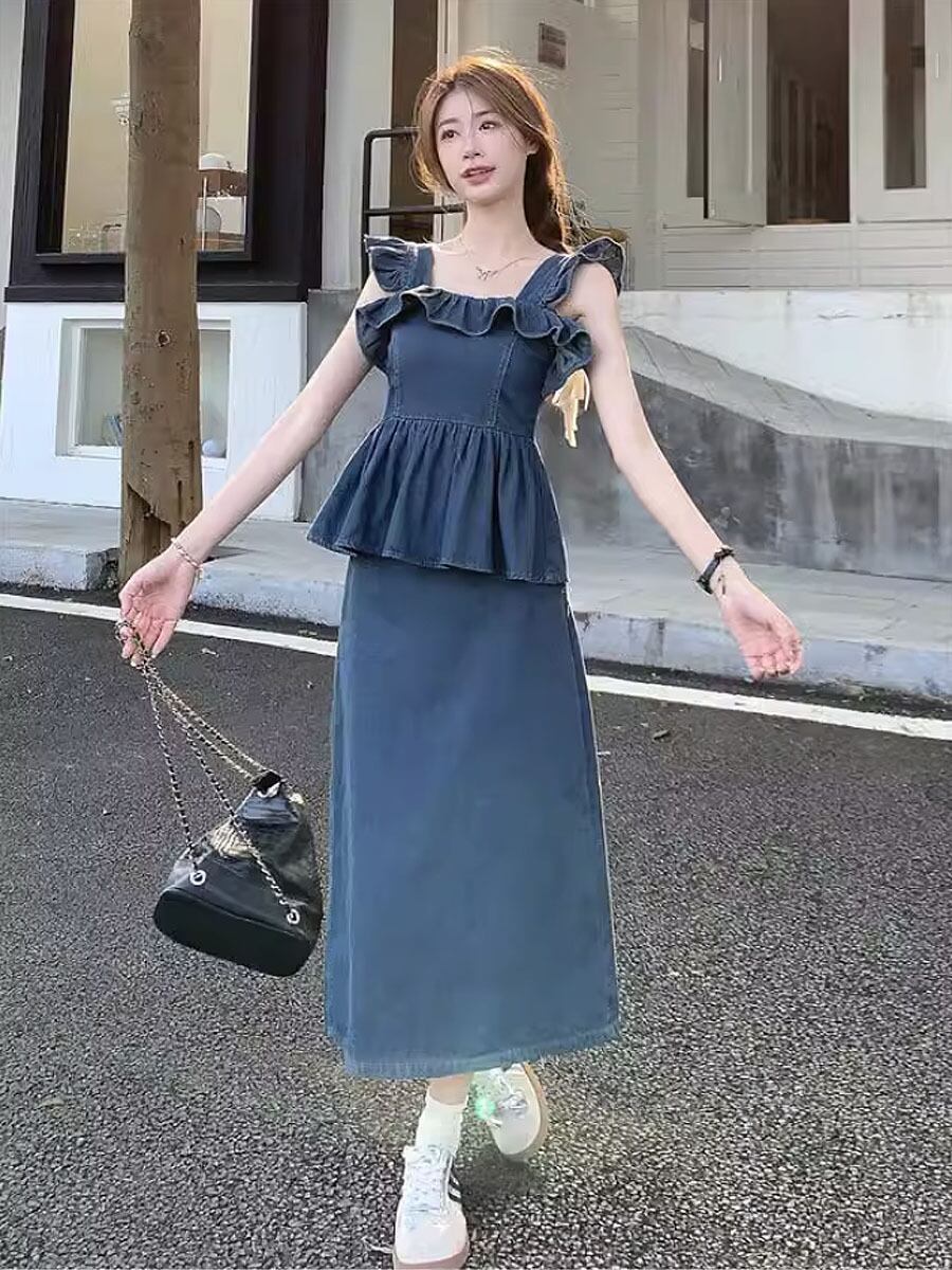 2点セット デニムへプラムキャミソール+ミモレ丈スカート セットアップ へプラム フリル フライングショルダー風 バックシャーリング シャーリング ソフトフィット トラペーズスカート 台形スカート かわいい 大人可愛い きれいめ シンプル 上品 おしゃれ お洒落 かっこいい レトロ 大人女子 こなれ感 ラブリー ガーリー 個性的 モード系 エレガント 韓国コーデ 韓国ファッション 青 ブルー インディゴブルー デニムブルー