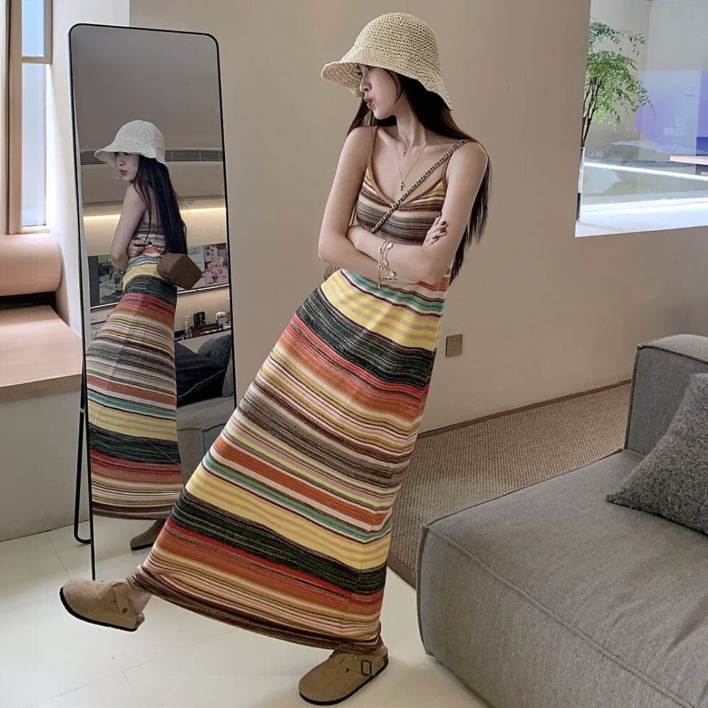 マルチカラーの細かいボーダー模様で、くるぶしまでのマキシ丈ワンピースです。