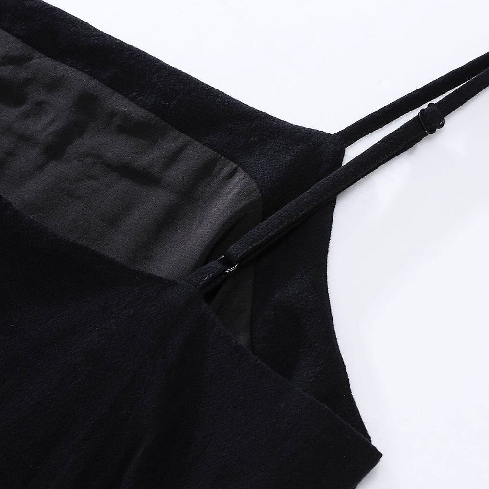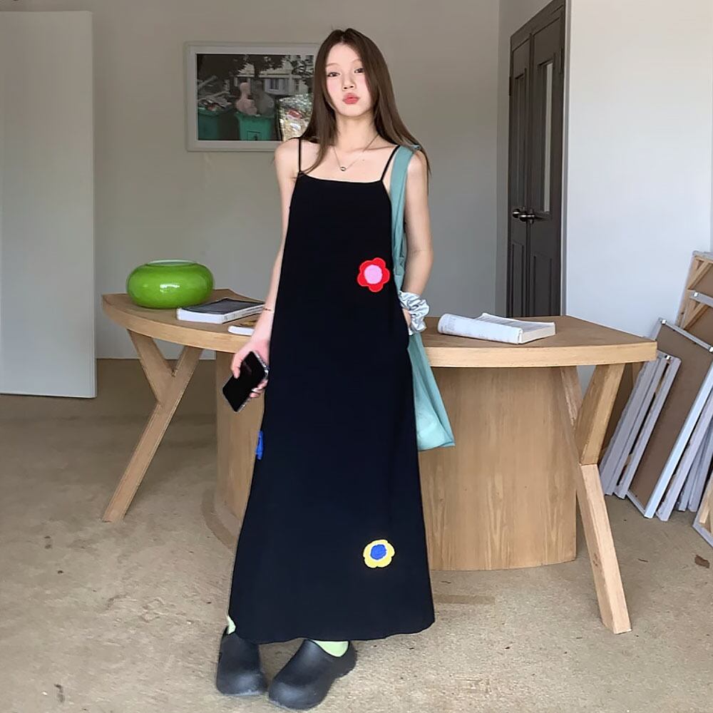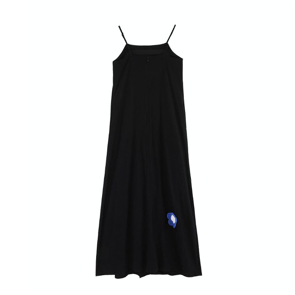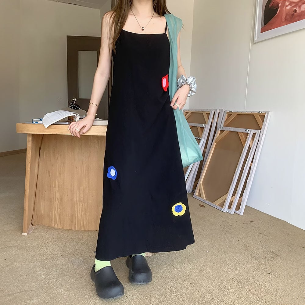 シンプルなブラックにかぎ針編みのお花モチーフがついたキャミソールワンピースです。