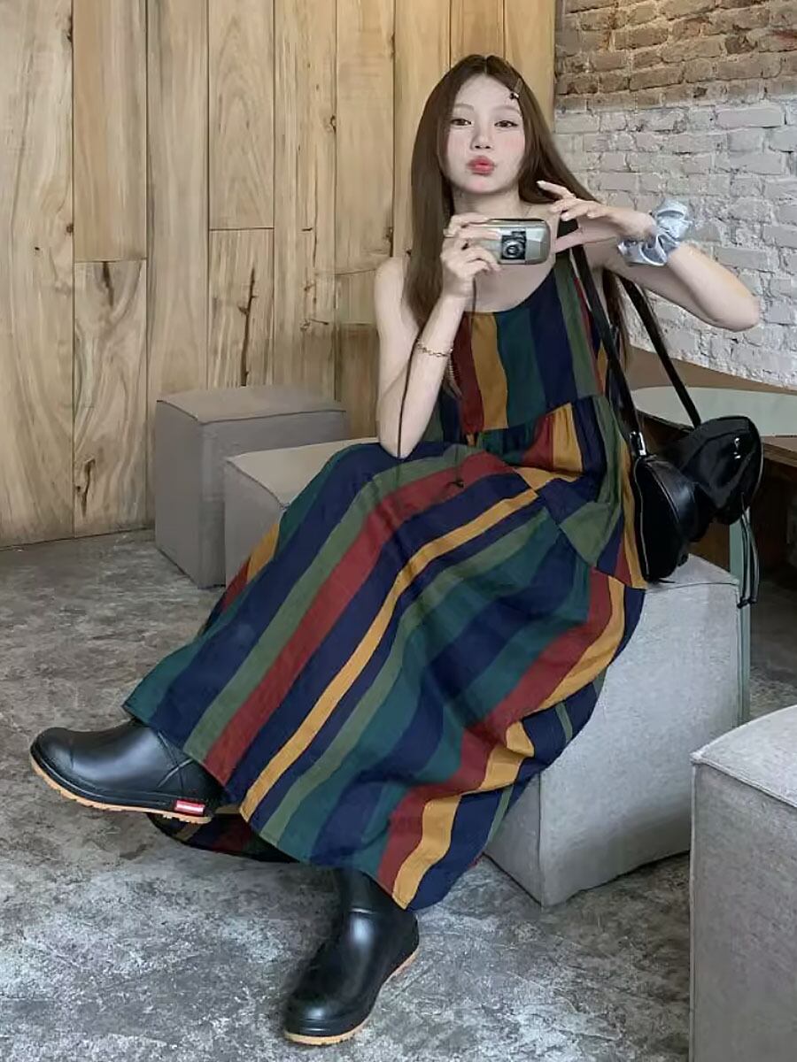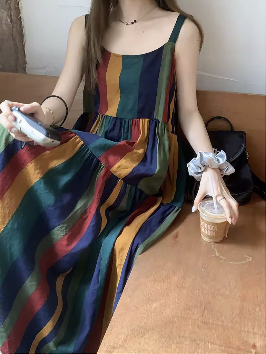 カラフルモザイクブロックロングキャミソールワンピース キャミワンピ ワンピース サマーワンピ ティアードワンピース ティアード ストラップ太め Aライン ゆったり ゆとりあり 楽ちん 締めつけ感なし かわいい 大人可愛い きれいめ シンプル 上品 おしゃれ お洒落 かっこいい レトロ 大人女子 こなれ感 ラブリー ガーリー 個性的 モード系 エレガント 韓国コーデ 韓国ファッション カラフル ストライプ 縞 シマシマ
