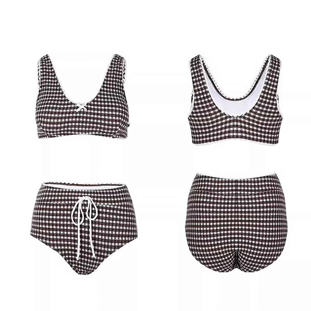 3点セット 水着 ビキニ スポーティビキニ上下+レース生地オーバーロングパンツ チェック チェック柄 タータンチェック ホックレス 楽ちん ハイウエスト タンキニ スポーティトップス パット付き ワイヤーなし ノンワイヤー シンプルデザイン 茶色 ブラウン アイボリー かわいい セクシー 大人可愛い ナチュラル おしゃれ お洒落 主役級 ラブリー キュート ガーリー ママ レディース 海 ビーチ プール リゾート 美脚 着痩せ M L XL 茶色 韓国コーデ 韓国ファッション