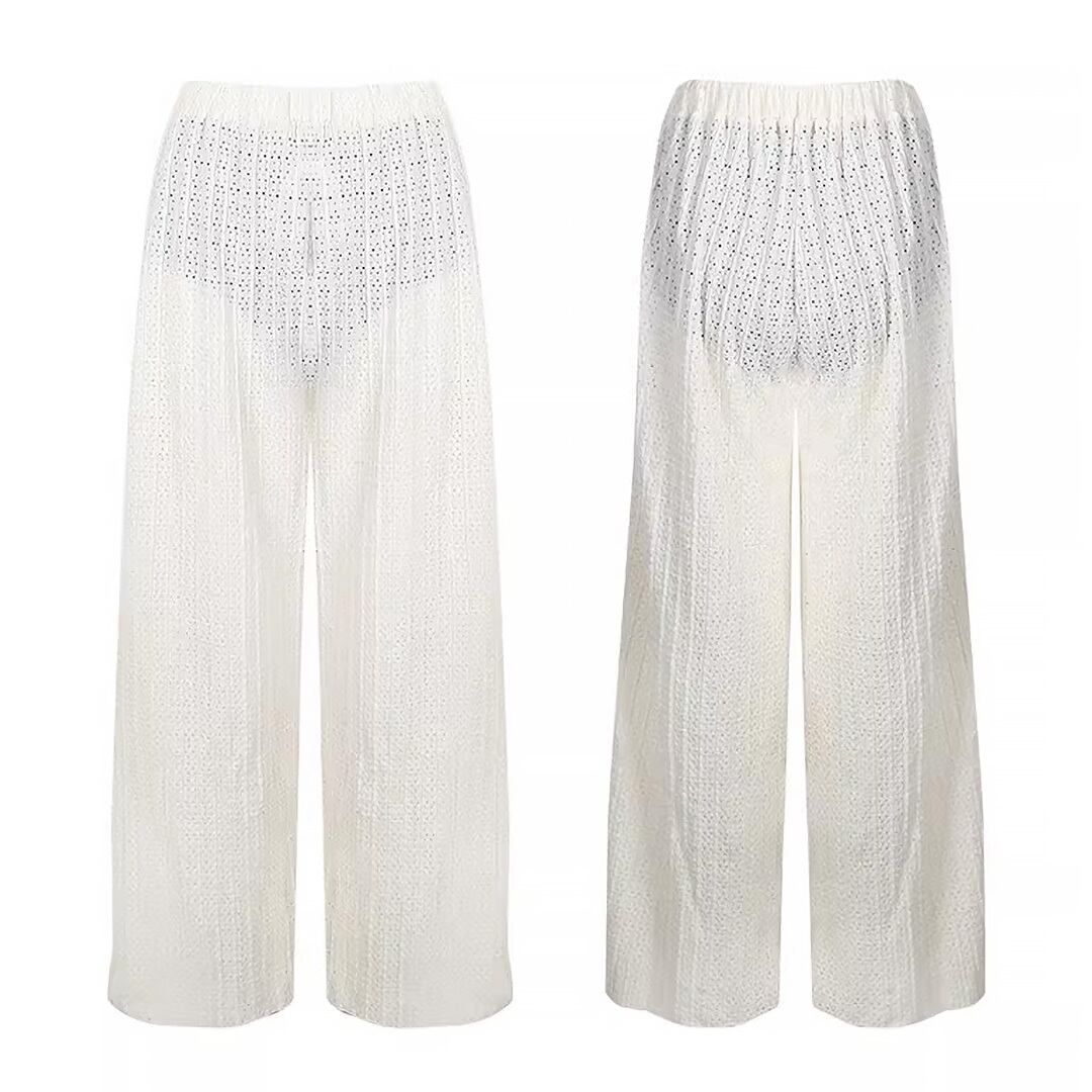 オーバーロングパンツはレース生地で、フェミニンなイメージです。