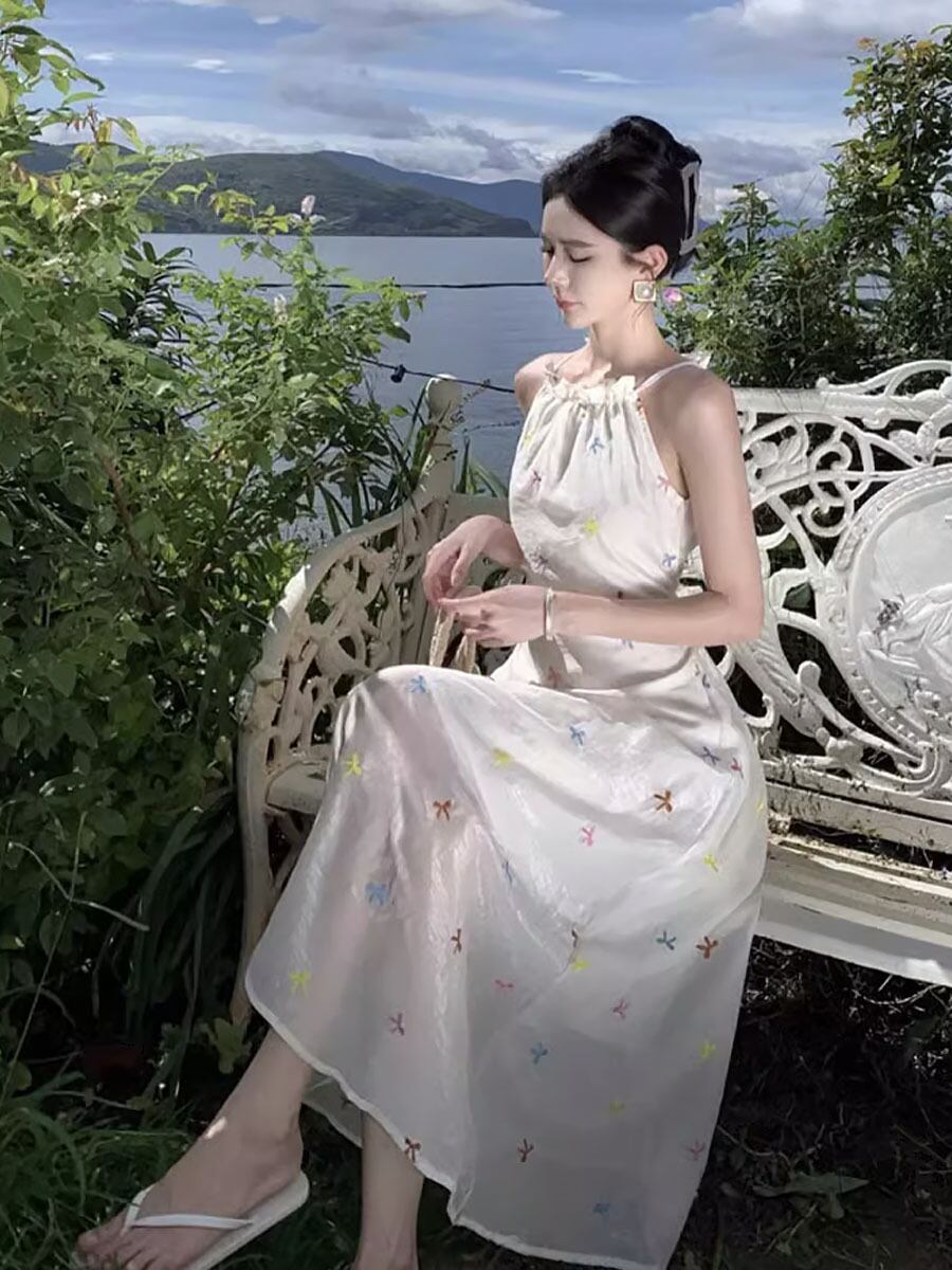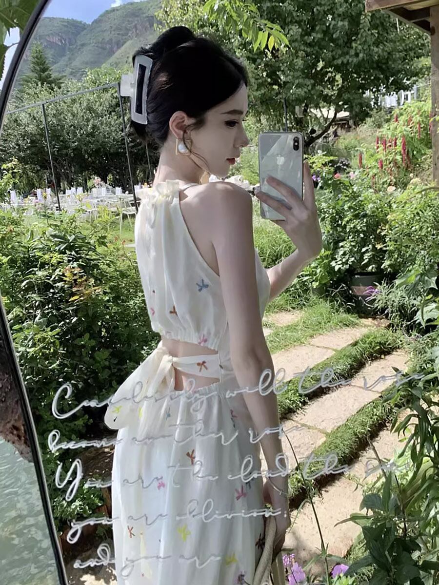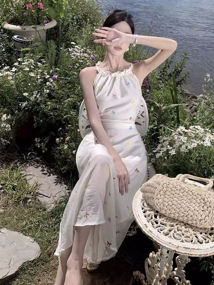 バックオープン刺繍ロングワンピース 背中開き 背中見せ ちら見せ 腰開き 腰見せ フレンチウエスト カットアウト 刺繍 リボン刺しゅう Aライン ギャザー フレア ワンピース 可愛い カジュアル 大人 おしゃれ 大人可愛い 大人女子 キュート ガーリー 春 夏 大人可愛い きれいめ シンプル 大人 上品 おしゃれ 大人女子 レディース 通学 デート お出かけ 女子会 イベント リゾート 旅行 普段使い 休日 お揃い オルチャン 韓国コーデ 韓国ファッション ホワイト 白
