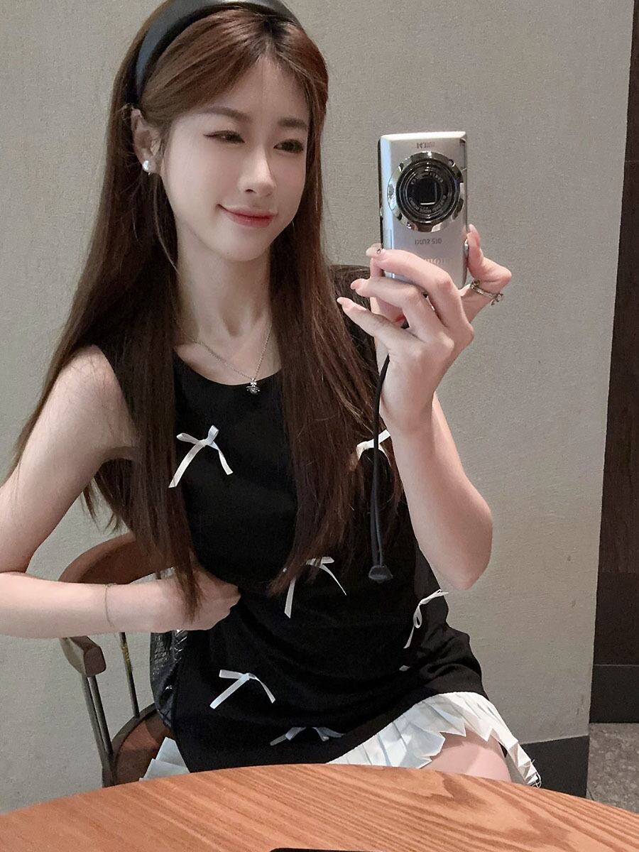 リボンデザインノースリーブミニワンピース ノースリーブ 裾プリーツ ブラック ラウンドネック リボン付き リボン バイカラー 白黒 モノクロ ミニ丈 膝上 かわいい 大人可愛い きれいめ きれいめ きちんと感 シンプル 上品 おしゃれ お洒落 かっこいい レトロ 大人女子 こなれ感 ラブリー ガーリー 個性的 モード系 エレガント 韓国コーデ 韓国ファッション ブラック ホワイト 白 黒 バックファスナー フロントリボン