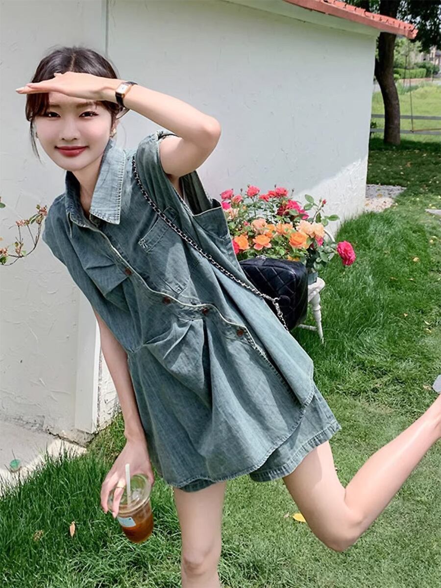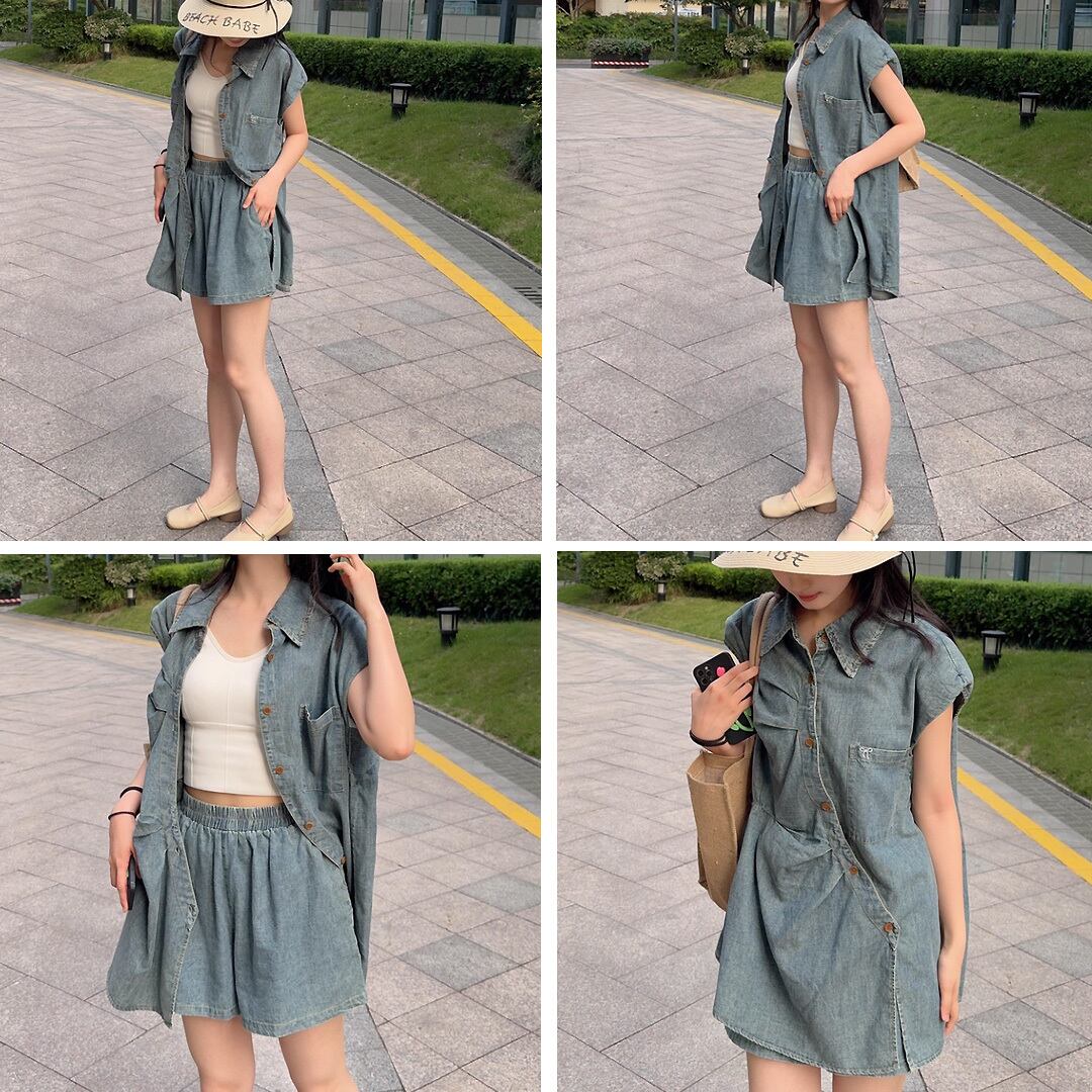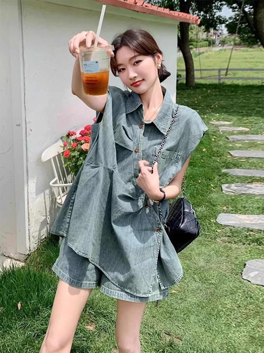 2点セット デニムノースリーブアシンメトリートップス+ショートパンツ セットアップ アシンメトリー 斜め前たて 合わせ斜め デニム サマーデニム ショートパンツ リボン ヒダ タック 立体的デザイン ノースリーブ デニム 短パン ブルー 青 インディゴブルー デニムブルー かわいい 大人可愛い きれいめ シンプル 上品 おしゃれ お洒落 かっこいい レトロ 大人女子 こなれ感 ラブリー ガーリー 個性的 モード系 韓国コーデ 韓国ファッション