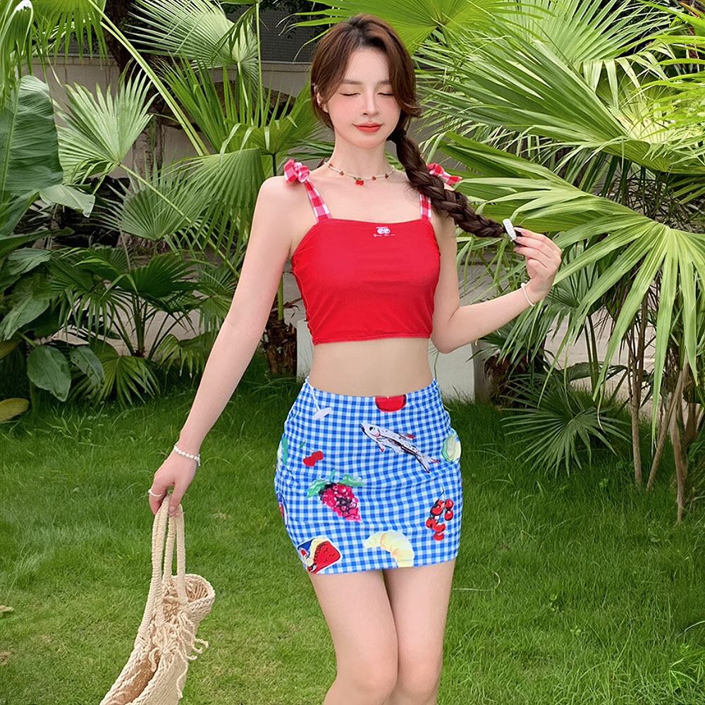3点セット 水着 キャミソール風ビキニ上下+タイトスカート ビキニ タンキニ タイトスカート チェック柄 フードプリント 食べ物ブリント レッド ブルー チェック 赤 青 タイトスカート風パレオ パレオ ボーイレッグ ボーイレングス エメラルドグリーン 日焼け防止 パッド付き かわいい 大人可愛い おしゃれ ラブリー キュート レディース ビーチ プール リゾート 旅行 体系カバー 美脚 脚長 スタイルアップ 美スタイル モテ インスタ映え 韓国コーデ 韓国ファッション