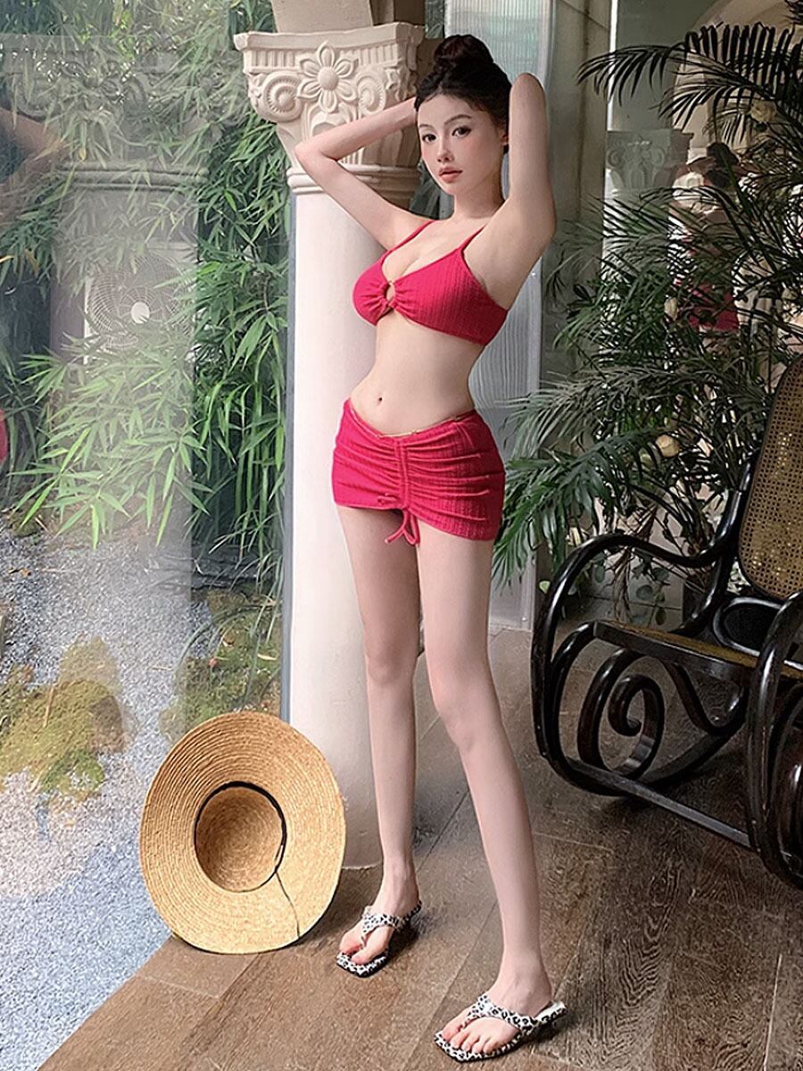 3点セット 水着 フロントリングビキニ+ドロストスカート ホックレス 赤 レッド ローズレッド 明るい赤 ドロスト ドロストスカート ハイレグ ハイレッグ レディース スイムウェア ハイウエスト パッド付き ワイヤーなし リボン 露出少なめ 体系カバー ウエストマーク ガーリー 可愛い おしゃれ お洒落 女っぽ 個性的 無地 レディース ホテル 温泉 海 ビーチ プール リゾート 旅行 韓国コーデ 韓国ファッション