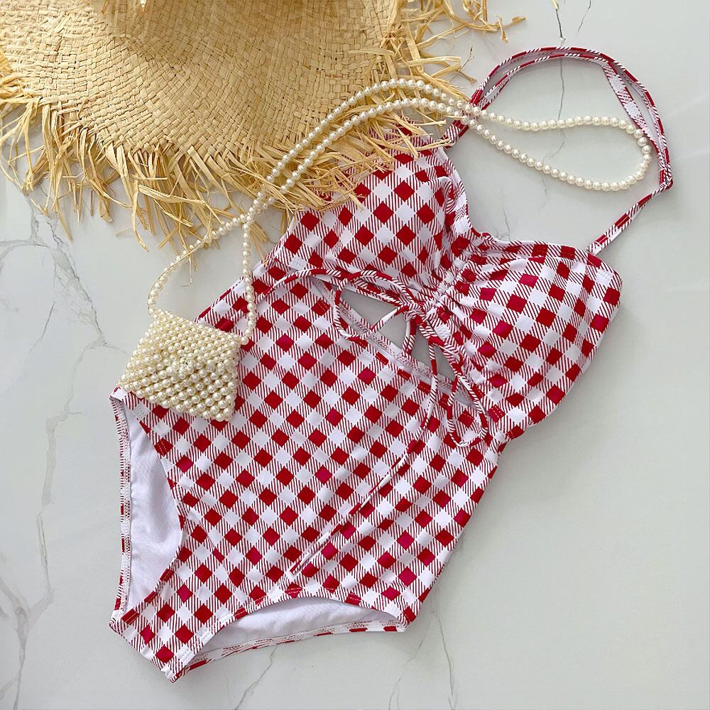 水着 ギンガムチェックカットワンピース水着 レッド 赤 ギンガムチェック モノキニ バックコンシャス バックシャン ホルターネック 背中カット バックカットアウト ドロスト ワンピース スイムウェア 背中空き スタンダード パッド付き ノンワイヤー フェミニン ガーリー インスタ映え おしゃれ お洒落 レディース 女性用 ホテル 温泉 海 リゾート 旅行 スタイルアップ 韓国コーデ 韓国ファッション