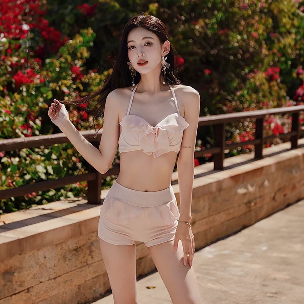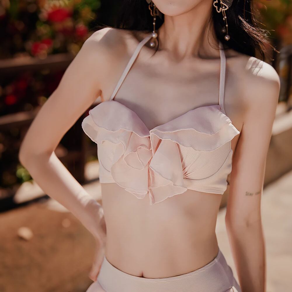 3点セット 水着 ホルターネックフリルビキニ上下+長袖カーディガン風ラッシュガード フリル フレア 薄ピンク ピンク ペールピンク ライトピンク ビキニ スイムウェア パッド付き しっかりホールド パッド ワイヤーあり 胸盛り 美脚 レトロ モダン フェミニン セクシー 上品 大人 お嬢様 おしゃれ お洒落 女っぽ 個性的 レディース ホテル 温泉 海 ビーチ プール リゾート スタイルアップ 美スタイル 韓国 韓国コーデ 韓国ファッション
