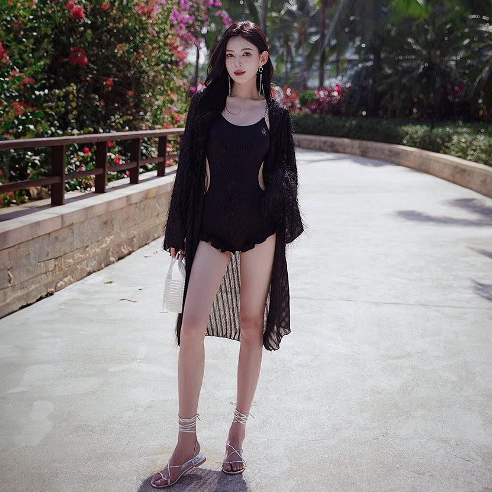 2点セット 水着 ストラップチェーンワンピース水着+レースラッシュガード モノキニ ブラック 黒 ワンピース水着 ノンワイヤー付き パッド付き 足ぐりフリル サイドカット バックカット フェザー生地 上品 お嬢様 プリンセス かわいい 大人可愛い シンプル 水遊び おしゃれ ラブリー キュート 個性的 かっこいい レディース 女性用 ビーチ プール リゾート 旅行 体系カバー 美脚 脚長 スタイルアップ モテ インスタ映え 韓国コーデ 韓国ファッション