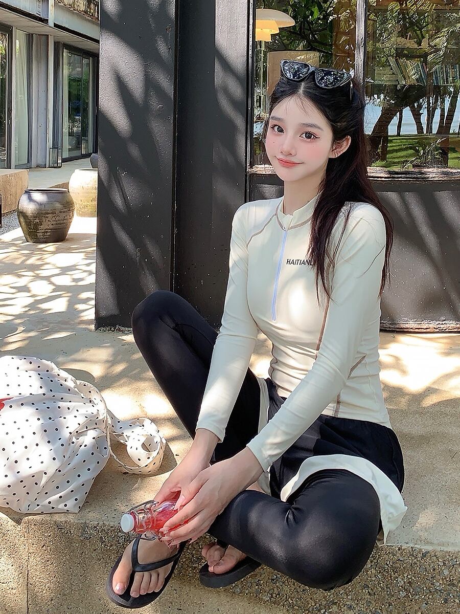 3点セット水着 長袖ハーフジップトップス+ロングパンツ+ショートフレアパンツ スポーティセパレート水着 ビキニ セパレート ダイビング 長袖 猛暑対策 酷暑対策 ラッシュガード水着 ショートパンツ フレア フィットネス オフホワイト アイボリー ブラック 白 黒 二の腕カバー 体型カバー スポーティ 水遊び きれいめ フェミニン かわいい パッド付き ノンワイヤー かわいい 大人可愛い きれいめ セクシー おしゃれ スタイリッシュ 美脚 脚長 韓国コーデ 韓国ファション