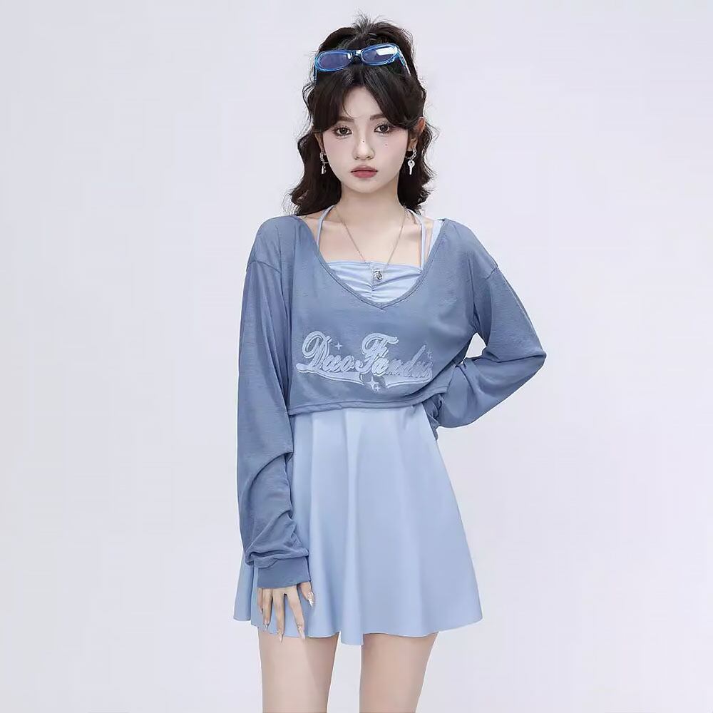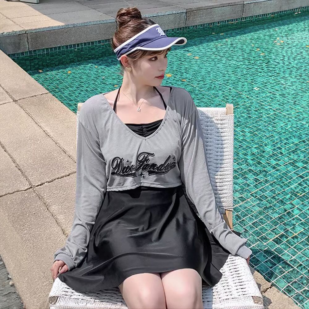 全2色 3点セット 水着 スカート付きツーピース水着+長袖ラッシュガード ツーピース 長袖 大きいサイズ ラージサイズ セパレート スポーティ スポーツ水着 フレアスカート スカート付き ダブルストラップ ホルターネック風 ロゴ入り 大人可愛い きれいめ セクシー 無地 大人っぽい おしゃれ 胸パッド付き ワイヤーなし 個性的 スタイリッシュ かっこいい 無地 夏 海 ビーチ プール リゾート 着痩せ スタイルアップ ブルー 青 黒 ブラック 灰色 グレー 韓国コーデ 韓国ファッション