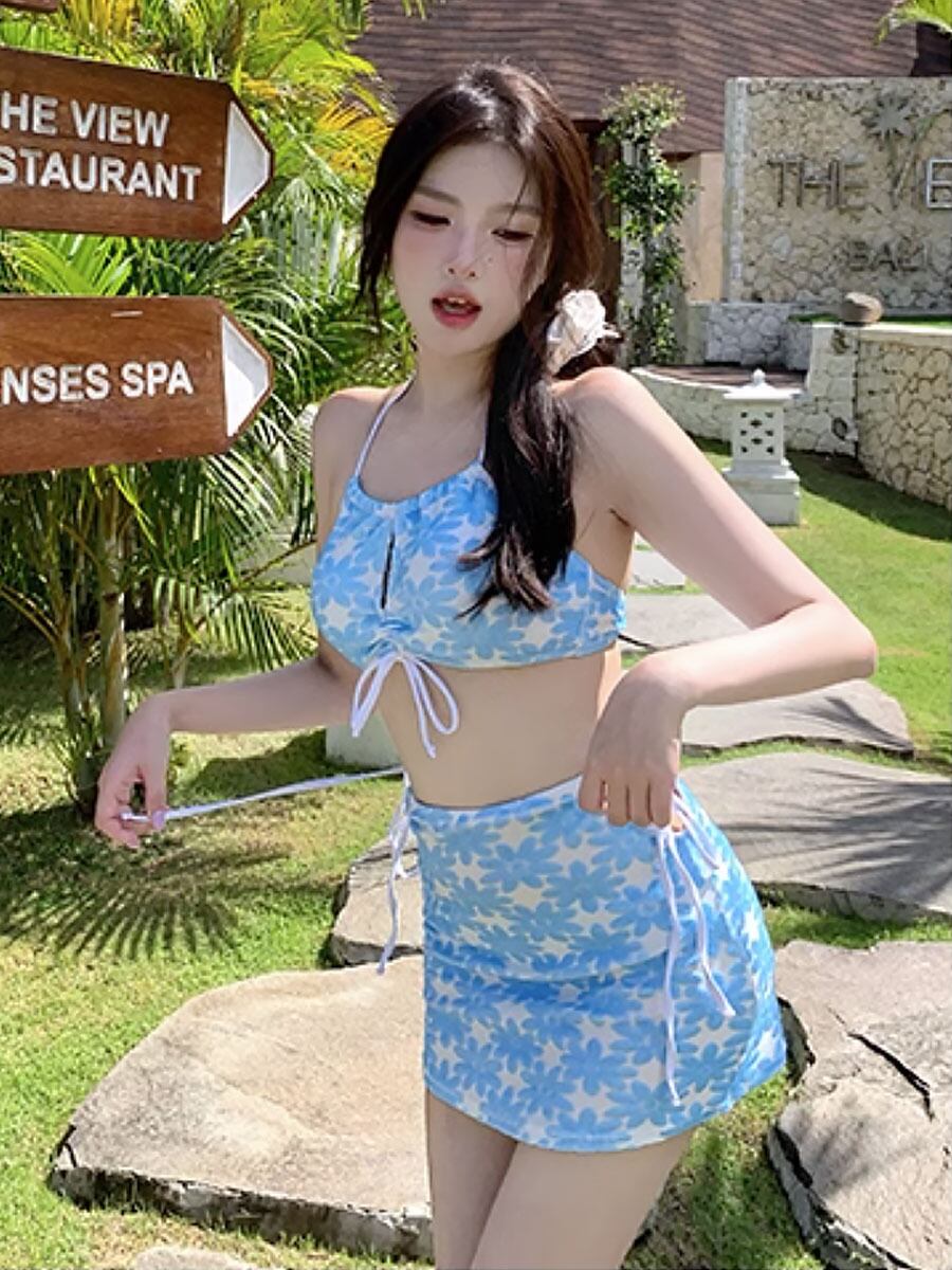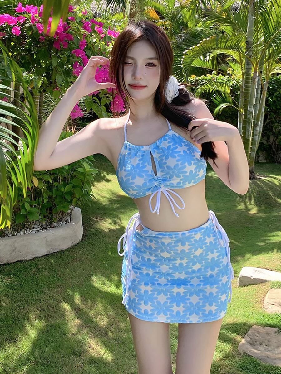 3点セット 水着 ブルーフラワー花柄ホルターネックビキニ上下+ミニスカパレオ ビキニ タンキニ ホルターネック タイトスカート 花柄 ミニスカート サイドリボン ブルー 青 水色 ライトブルー スカート風パレオ パレオ 日焼け防止 パッド付き かわいい 大人可愛い おしゃれ ラブリー キュート レディース ビーチ プール リゾート 旅行 体系カバー 美脚 脚長 スタイルアップ 美スタイル モテ インスタ映え 韓国コーデ 韓国ファッション